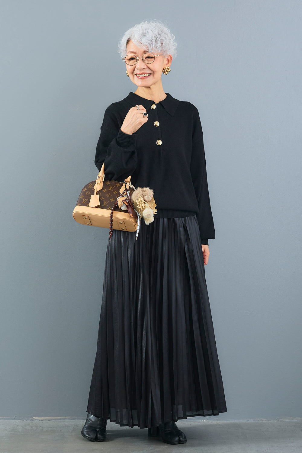【SET】ゴールドボタンカラーニット+レザーライクプリーツスカート(2set)