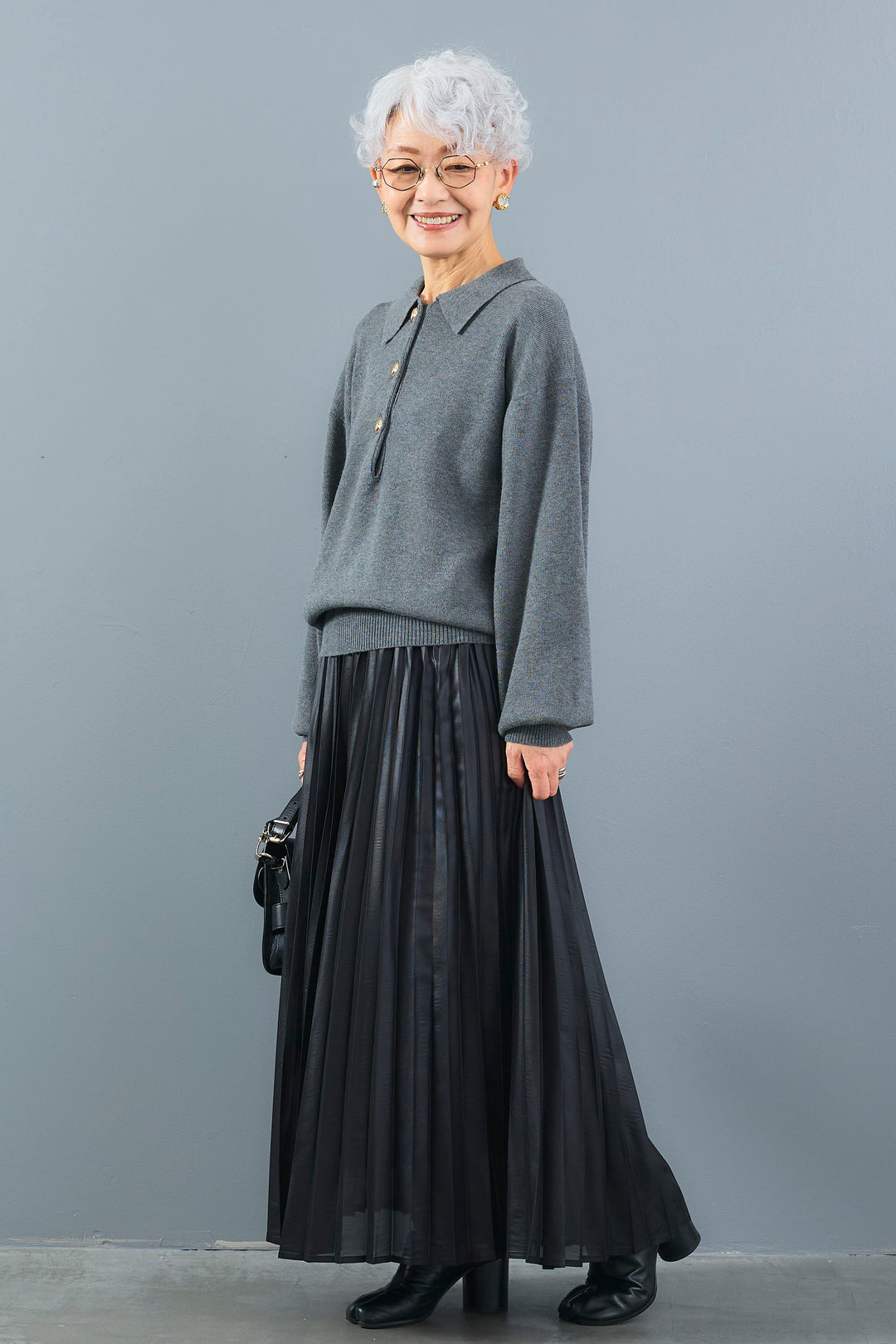 【SET】アシメハイネックボタンニット+レザーライクプリーツスカート(2set)