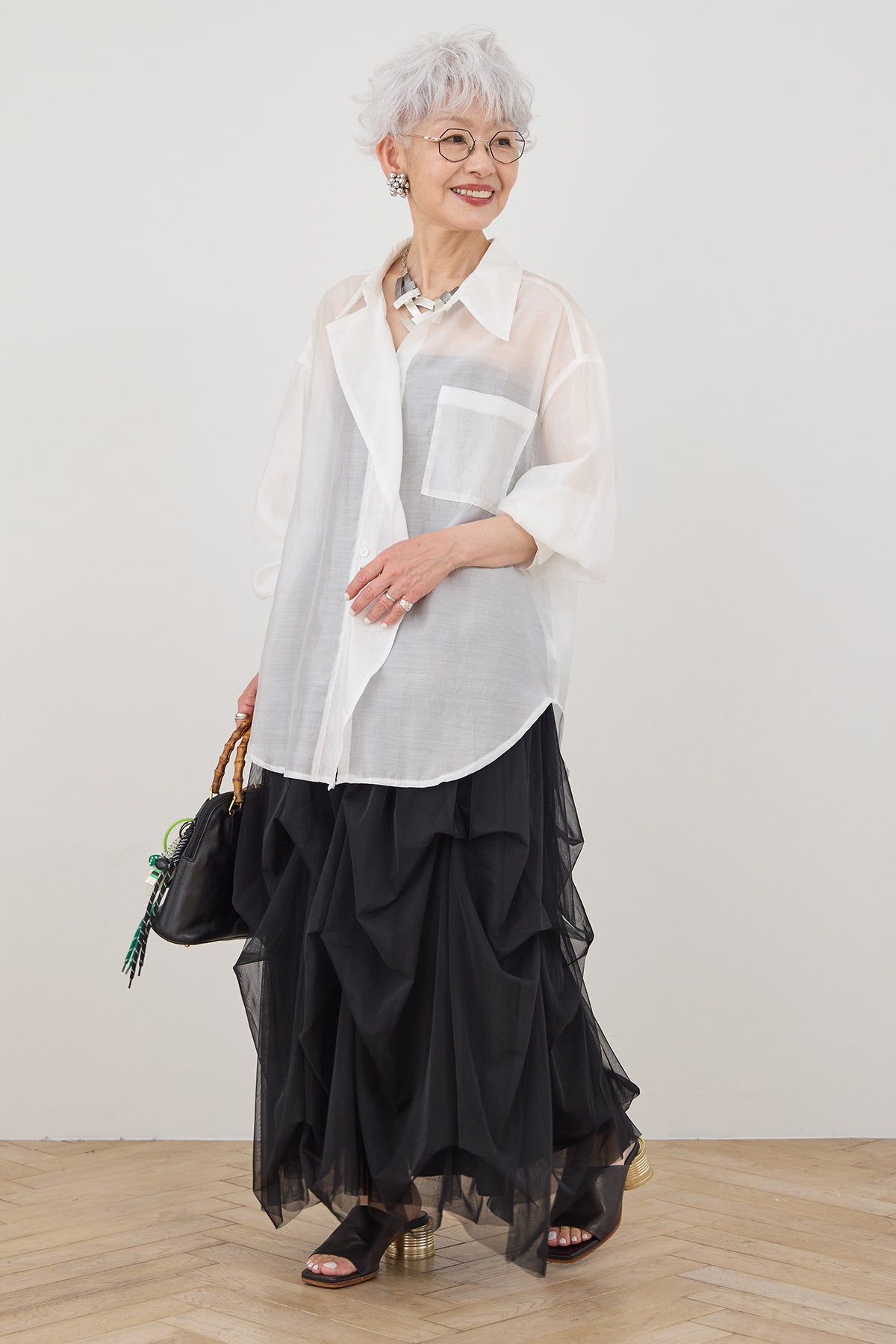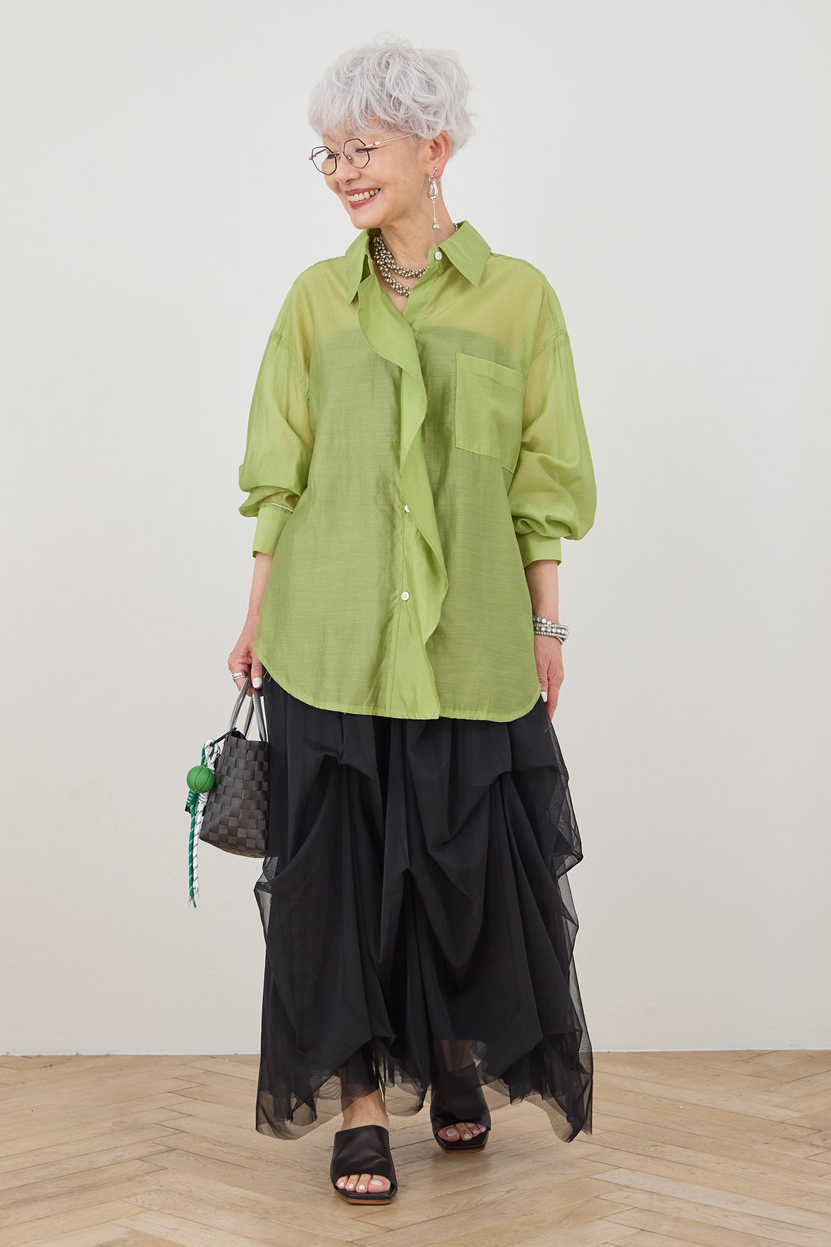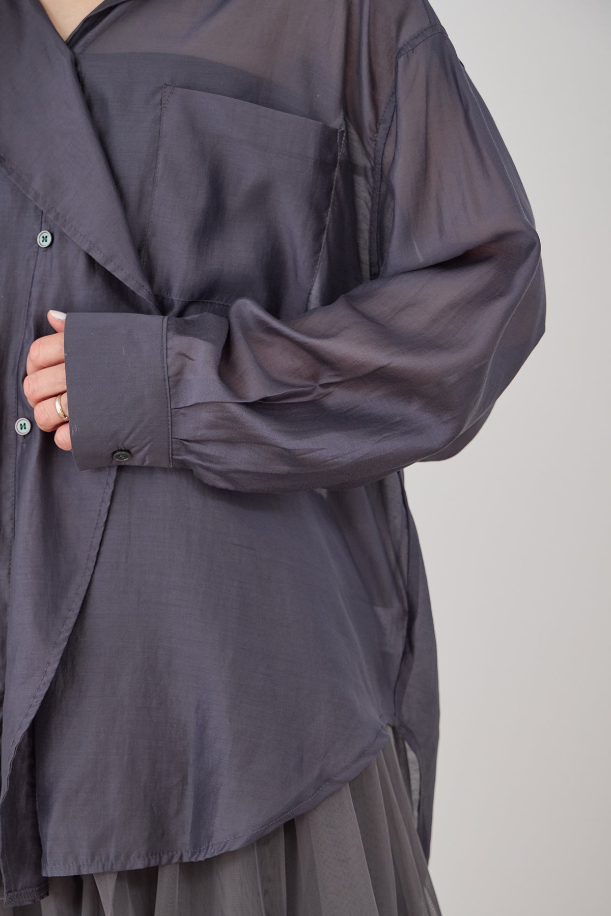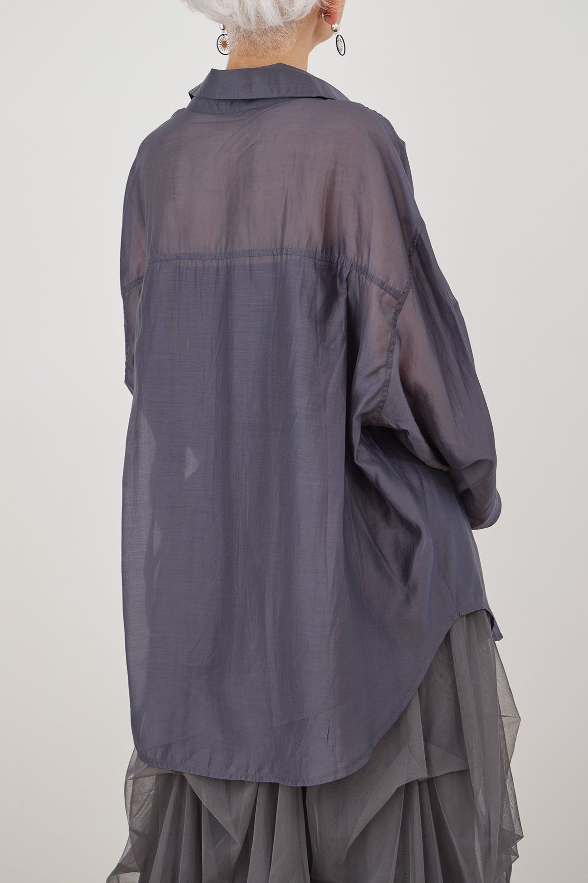 シアー素材を使用したフロントレイヤードアシンメトリーシャツ。軽やかで透け感のある生地が、シンプルながらも独自のデザインを際立たせ、アシンメトリーのカットが個性的でありながら上品な印象を与えます。レイヤードのディテールが動きに合わせて美しいシルエットを作り出し、カジュアルにもエレガントにも合わせやすいアイテムです。