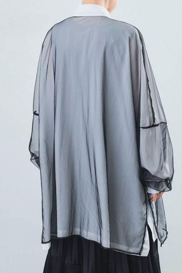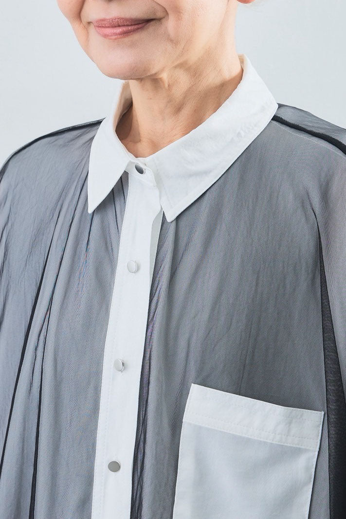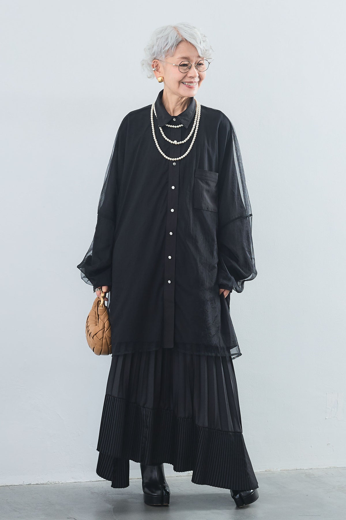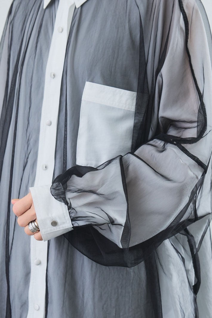 オーバーチュールレイヤードロングシャツは、シンプルながらもユニークなデザインが特徴の一着です。通常のシャツに、オーバーチュールのレイヤードを加えることで、軽やかさとボリューム感を演出し、シンプルなコーディネートに動きと奥行きを加えます。前面のシャツ部分はクラシックでありながら、チュールの透明感が加わることで現代的な印象に。リラックス感とモダンさを兼ね備えたアイテムで、カジュアルから少しドレッシーなスタイルまで幅広く活躍します。シンプルながらも個性を主張したい時にぴったりなアイテムです。