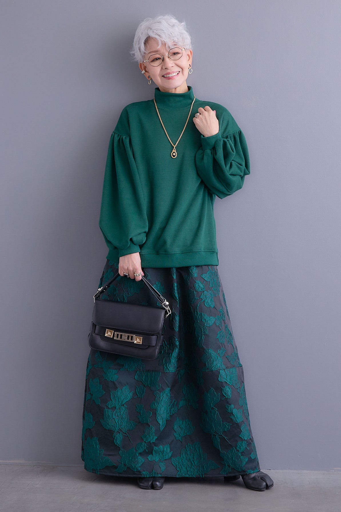 このスカートは、上品で華やかな印象を与えるジャガードフラワースカートです。深い緑色を基調にした生地に、立体的な花模様が施されており、豊かな質感と高級感を持っています。流れるようなシルエットと広がりのあるデザインで、エレガントな雰囲気を演出します。特別な日のコーディネートにぴったりのアイテムですね。