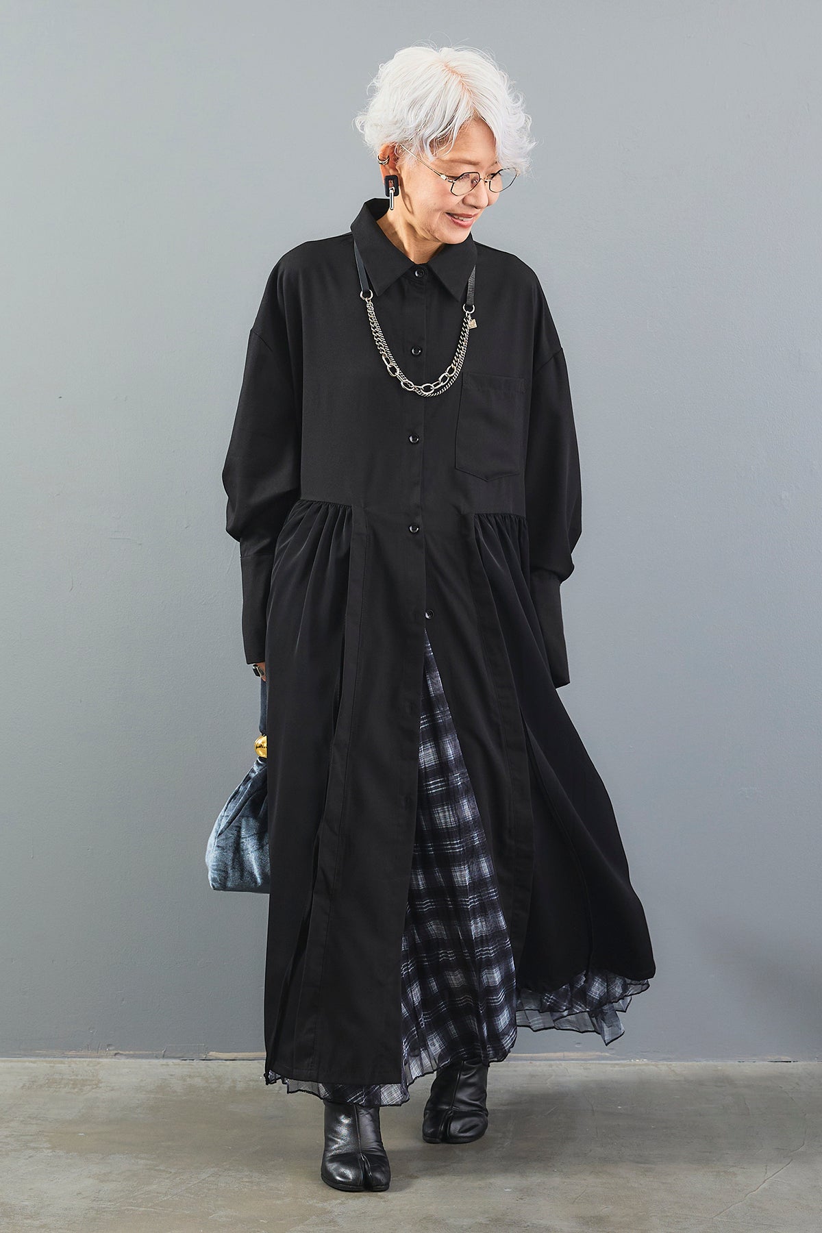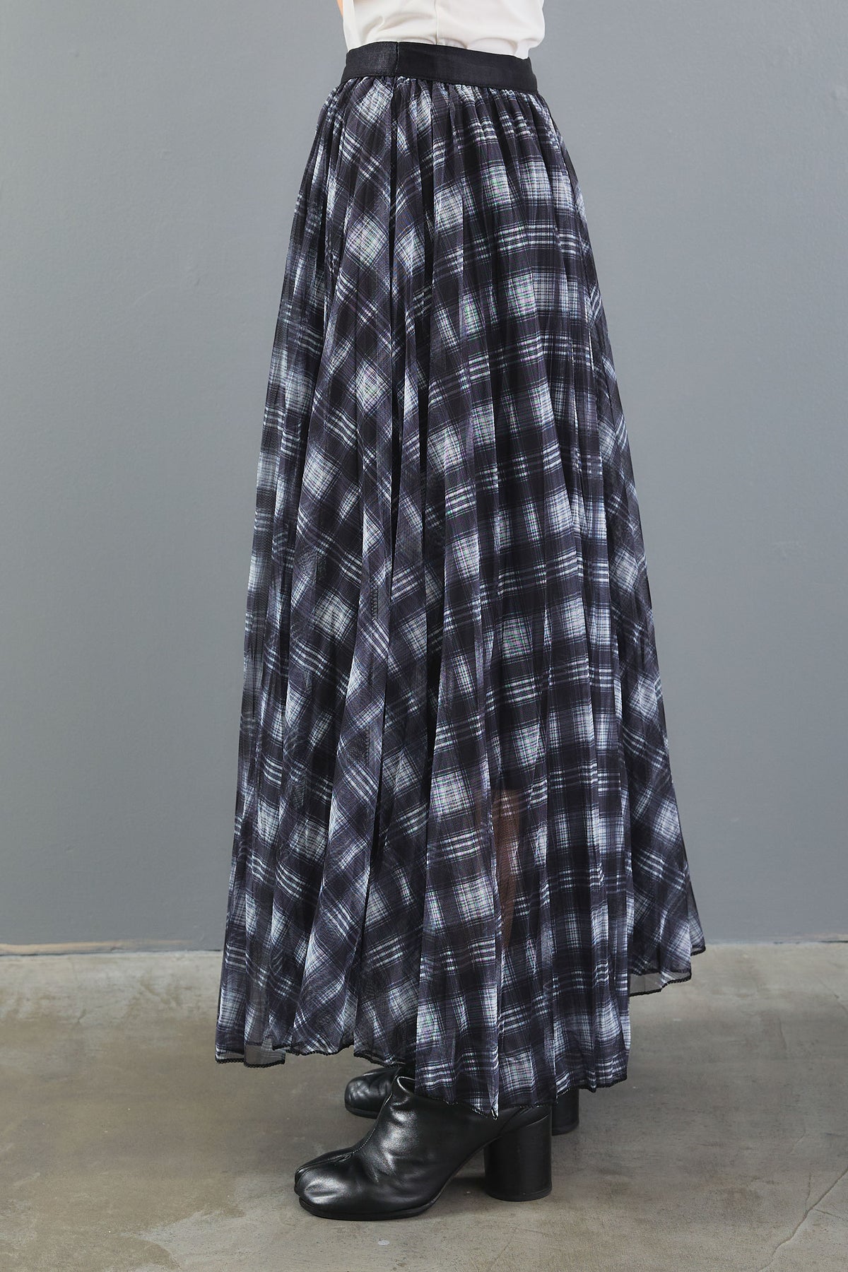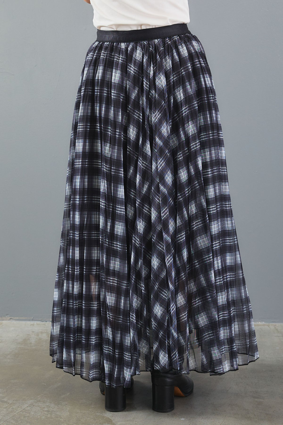 柔らかなシフォン素材にチェック柄をのせたプリーツスカート。ランダムなプリーツが軽やかに揺れ、動きのあるシルエットを演出します。落ち着いたトーンのチェック柄が大人っぽく、カジュアルからきれいめまで幅広く活躍。シーズンレスで着回せる万能な一枚です。