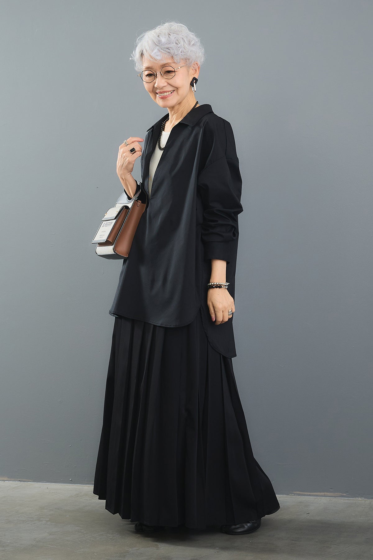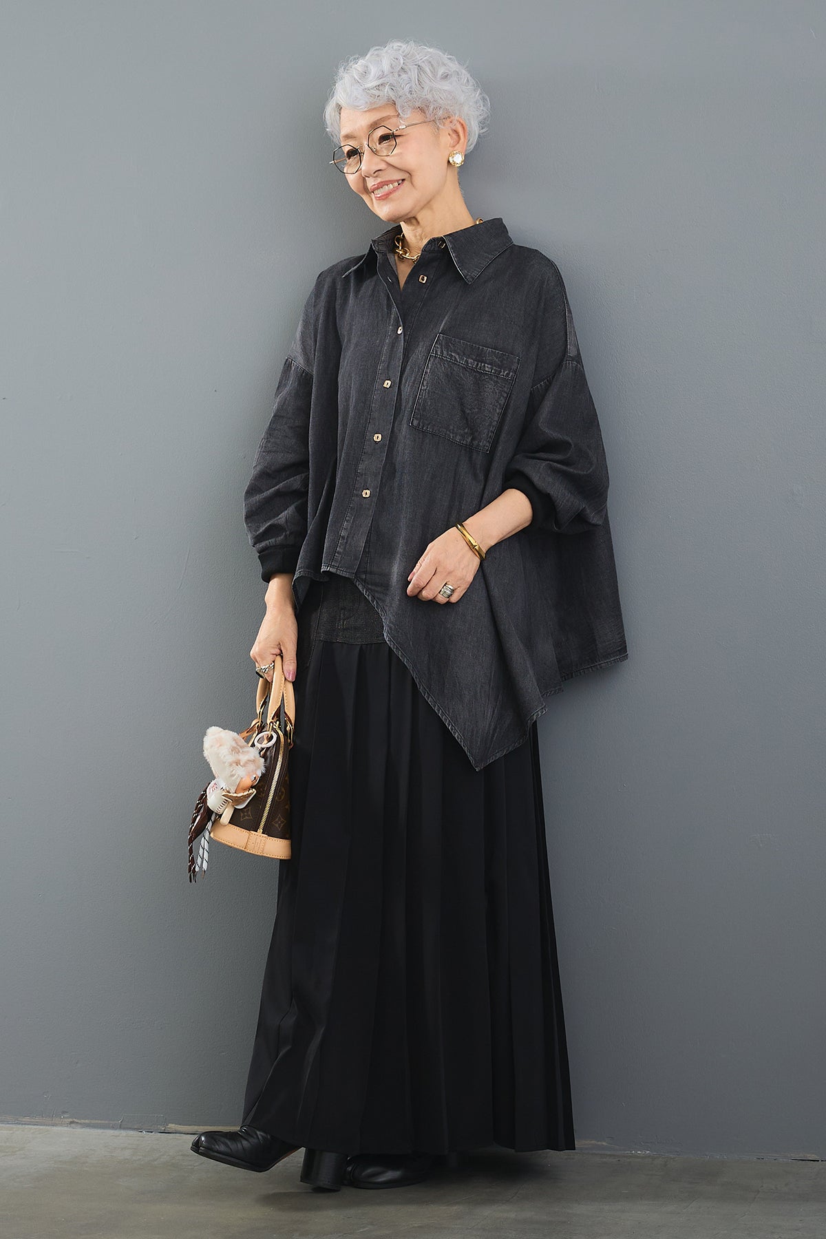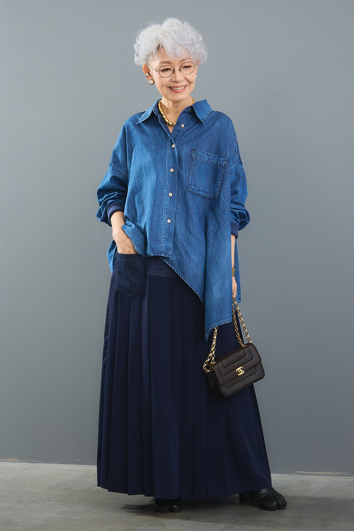 デニムとプリーツをドッキングさせた異素材ミックスのスカート。カジュアルなデニムのウエスト部分と、軽やかに揺れるプリーツデザインが絶妙にマッチし、コーディネートに存在感をプラスします。ロング丈で上品さを保ちながらも、遊び心あるデザインがこなれ感を演出。Tシャツを合わせればカジュアルに、ブラウスやジャケットと組み合わせれば大人っぽく着こなせます。シーズンレスで活躍する主役級スカートです。