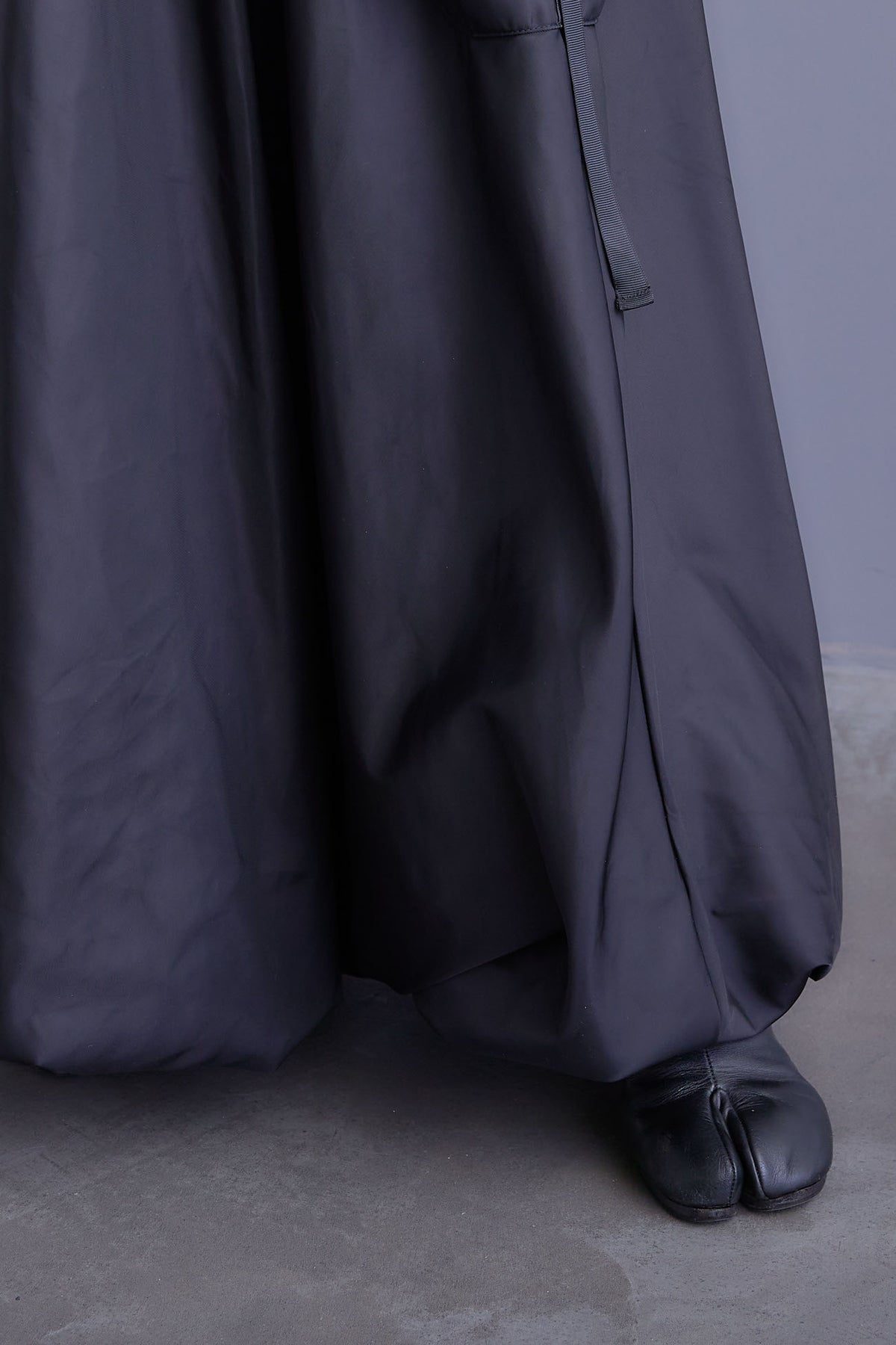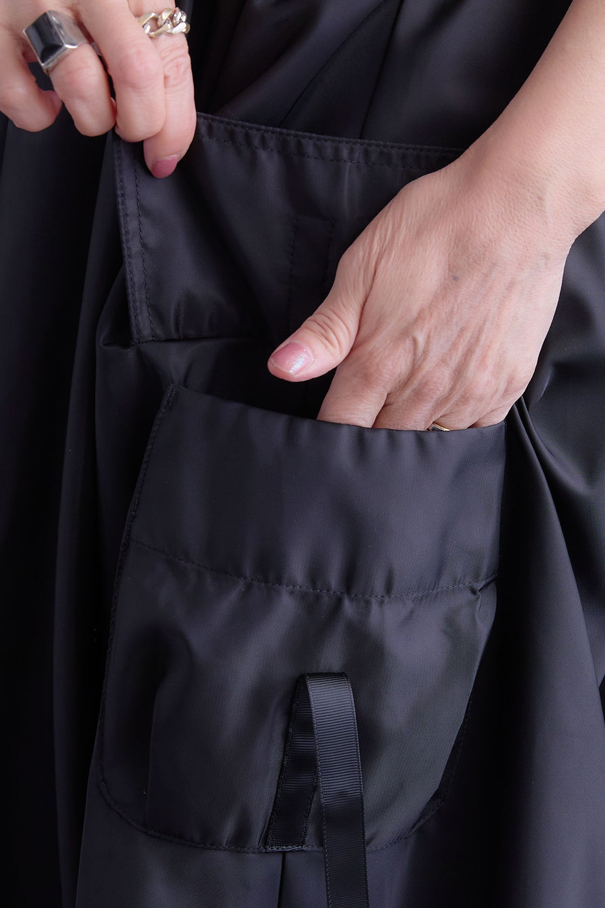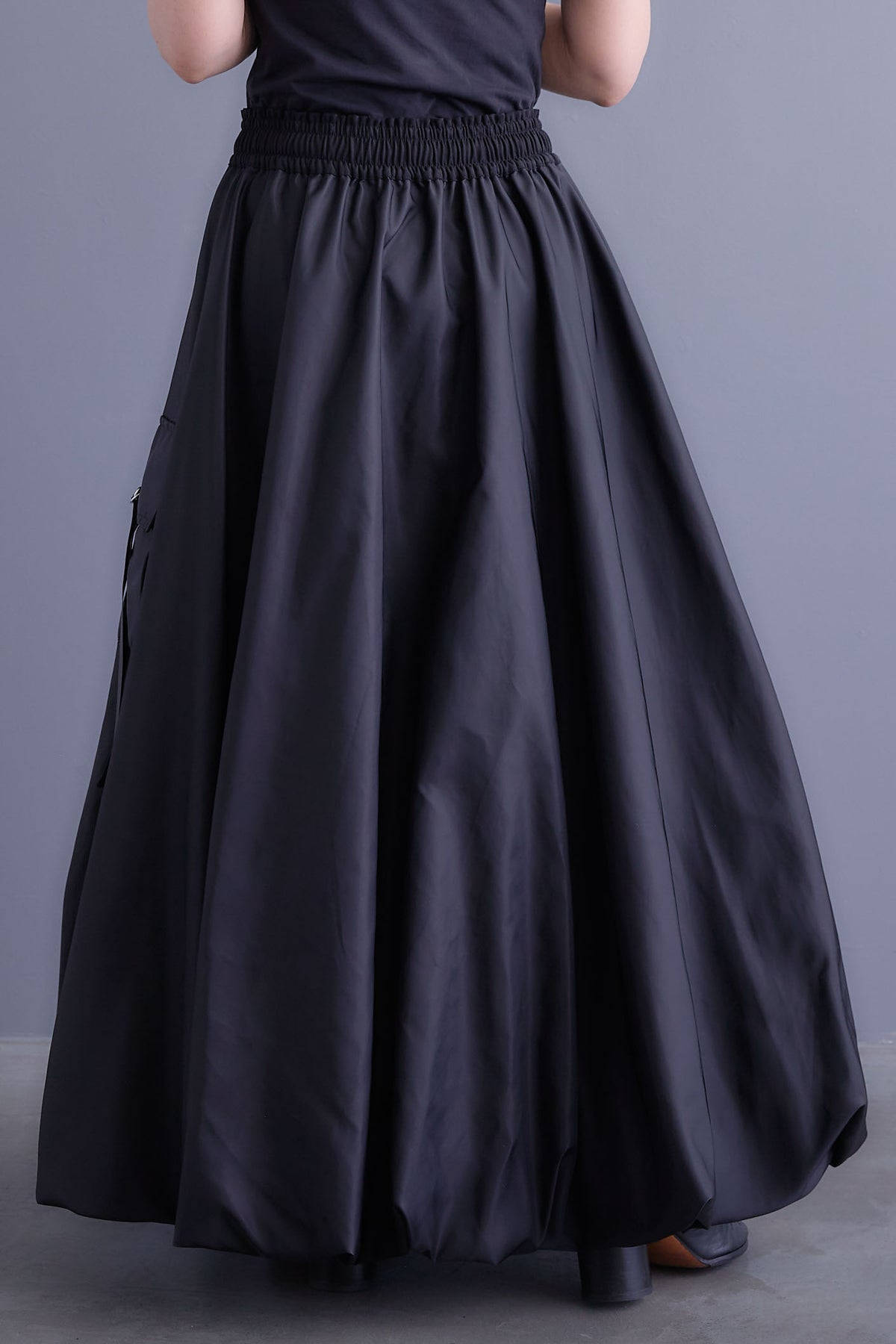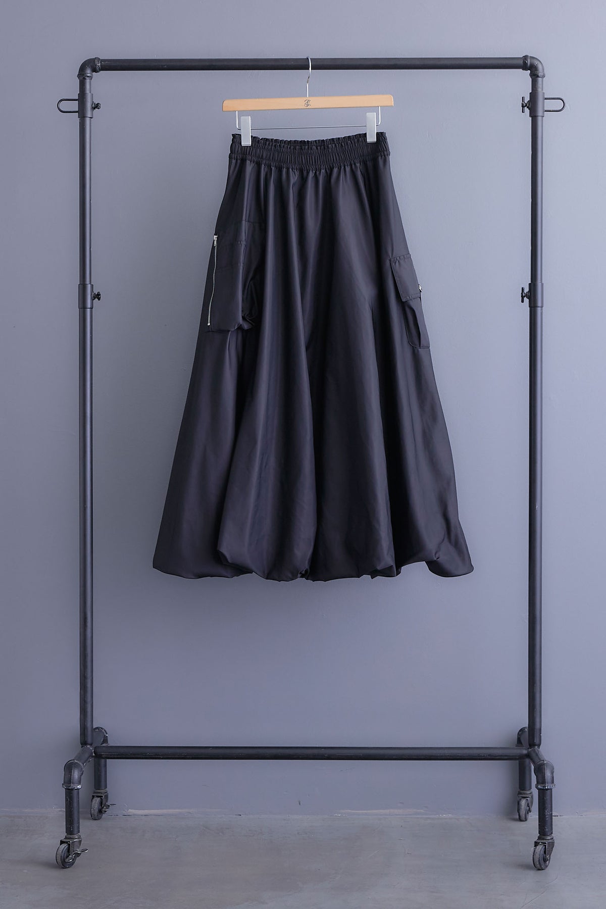 ミリタリー要素を取り入れたカーゴポケット付きのバルーンシルエットスカートです。たっぷりとしたギャザーとボリュームのある立体的なフォルムが特徴で、ウエストはゴム仕様のため、快適な着用感です。ほどよい光沢感のある生地が女性らしさもプラスし、カジュアルにもモードにも合わせやすい一枚です。