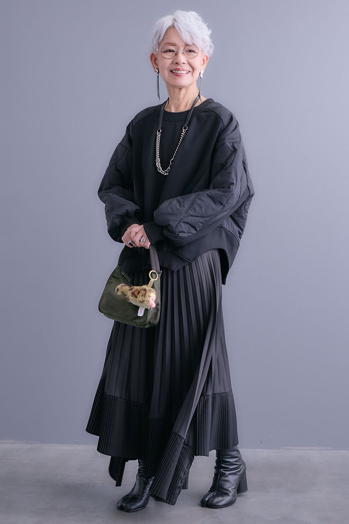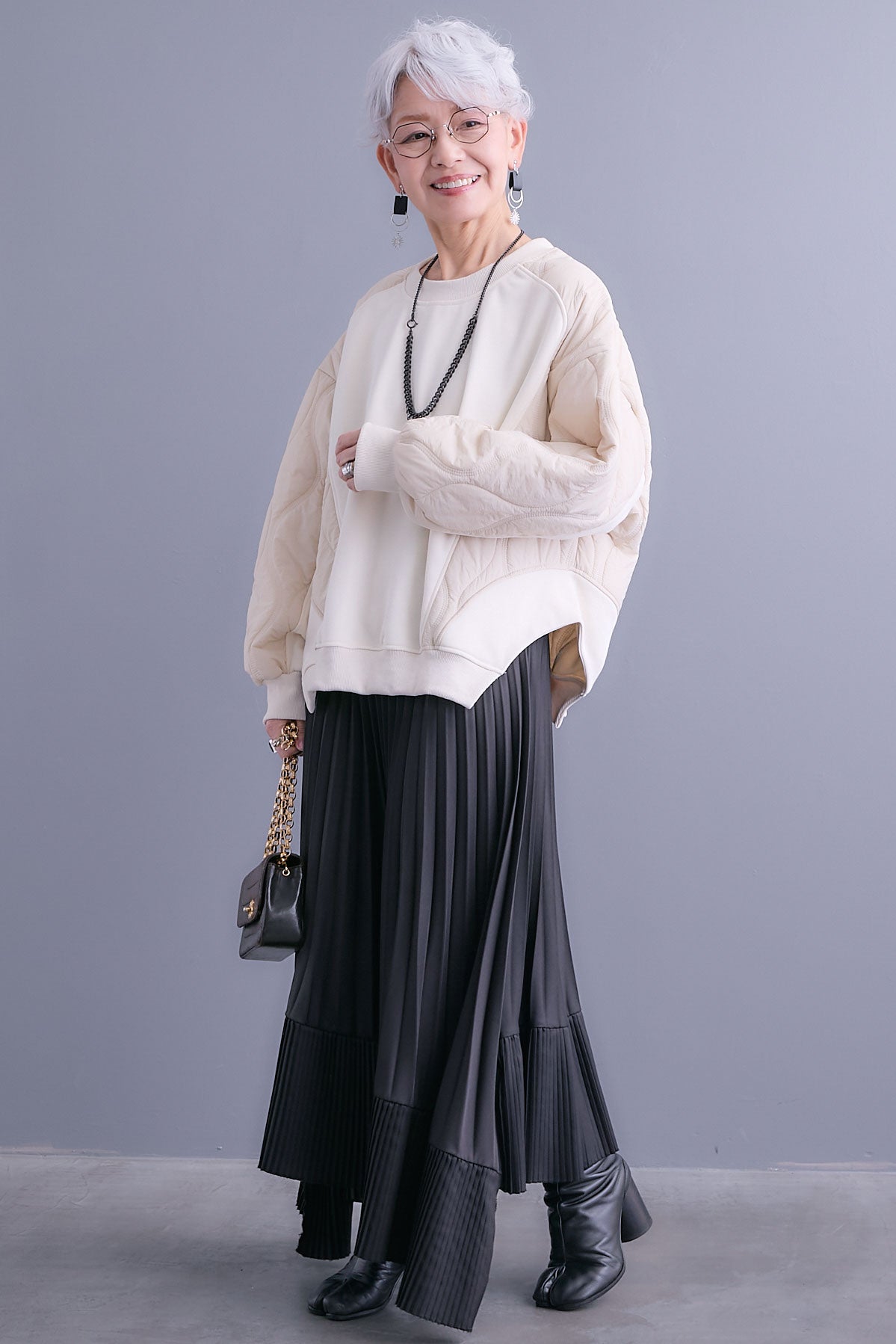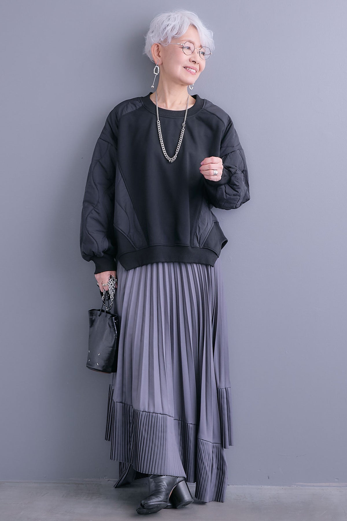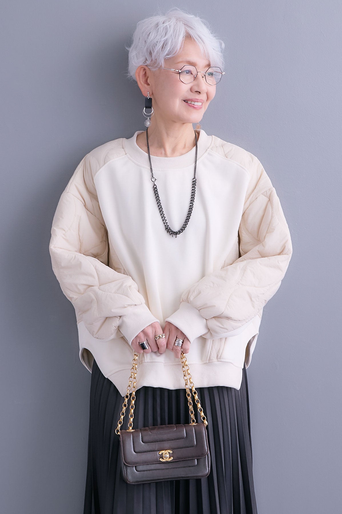 異素材ミックスが映えるデザインスウェット。フロントは滑らかな質感、袖はキルティングで表情を加えました。ゆったりしたフォルムで抜け感のある一着です。