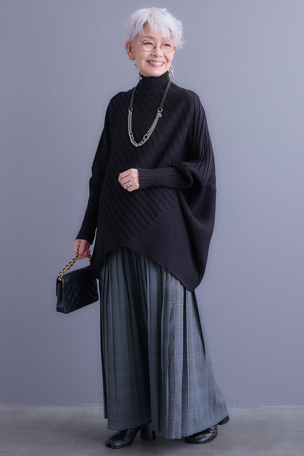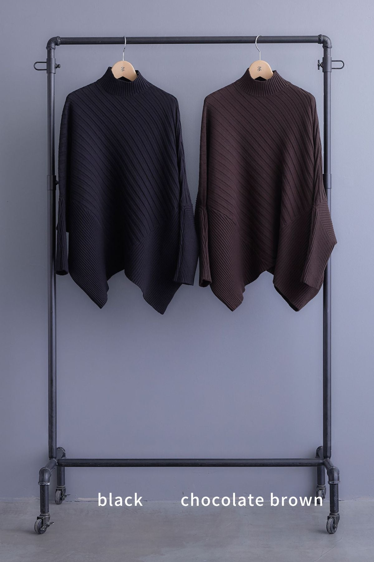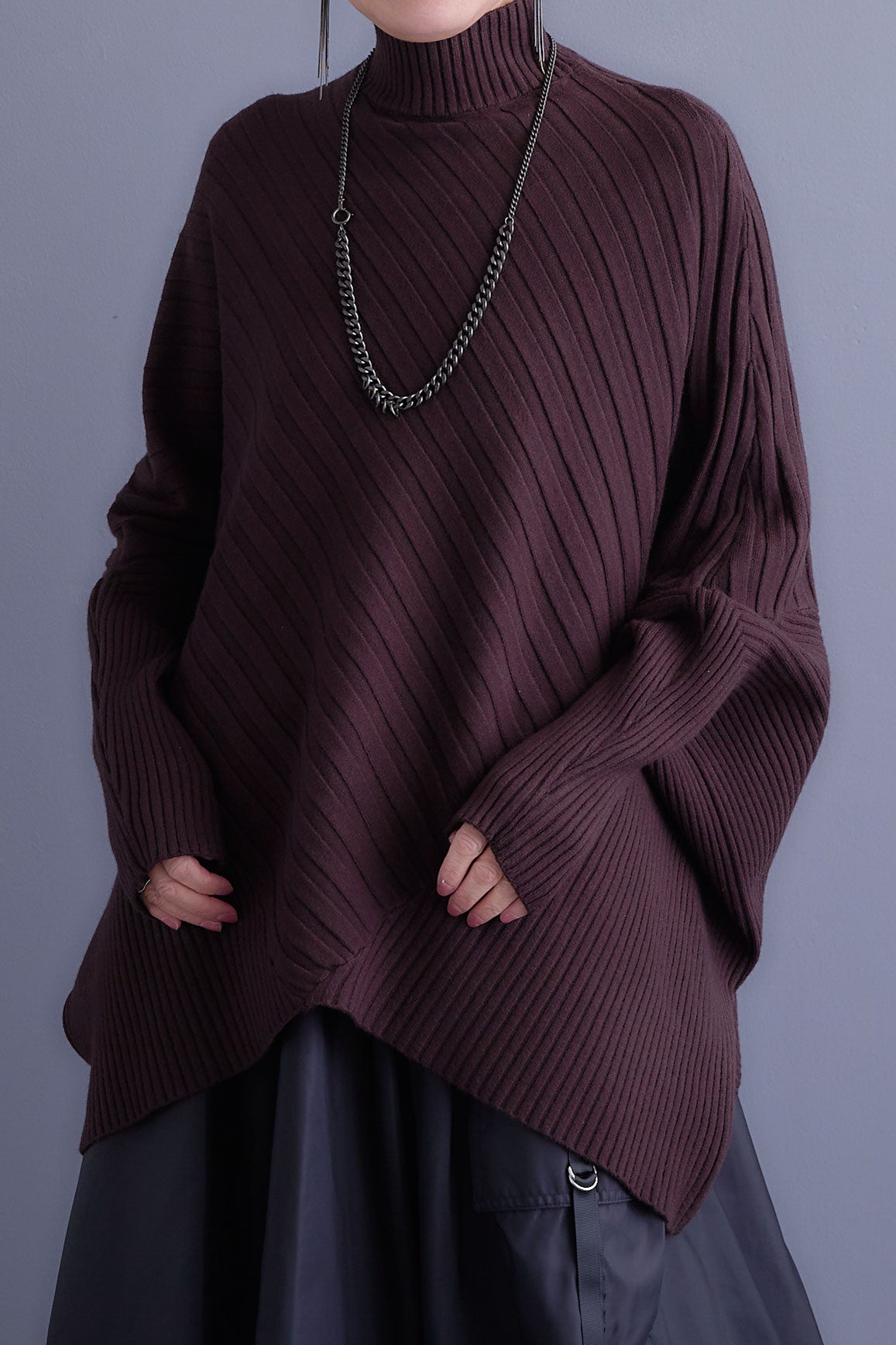 斜めのリブ編みが印象的なアシンメトリーデザインのタートルネックニット。ボリュームのあるドルマンスリーブとゆったりしたシルエットで、体型を拾わず着心地も抜群。裾にかけての変化のあるラインが着こなしにニュアンスを加え、シンプルながらもモード感漂う一枚。