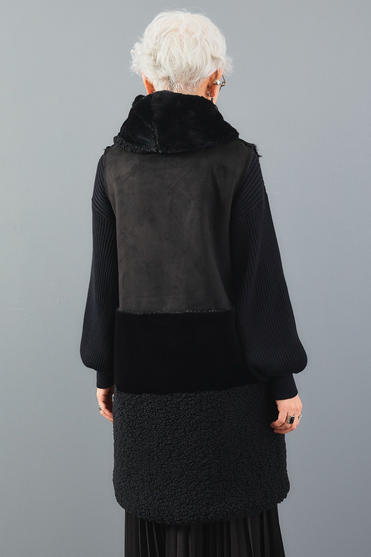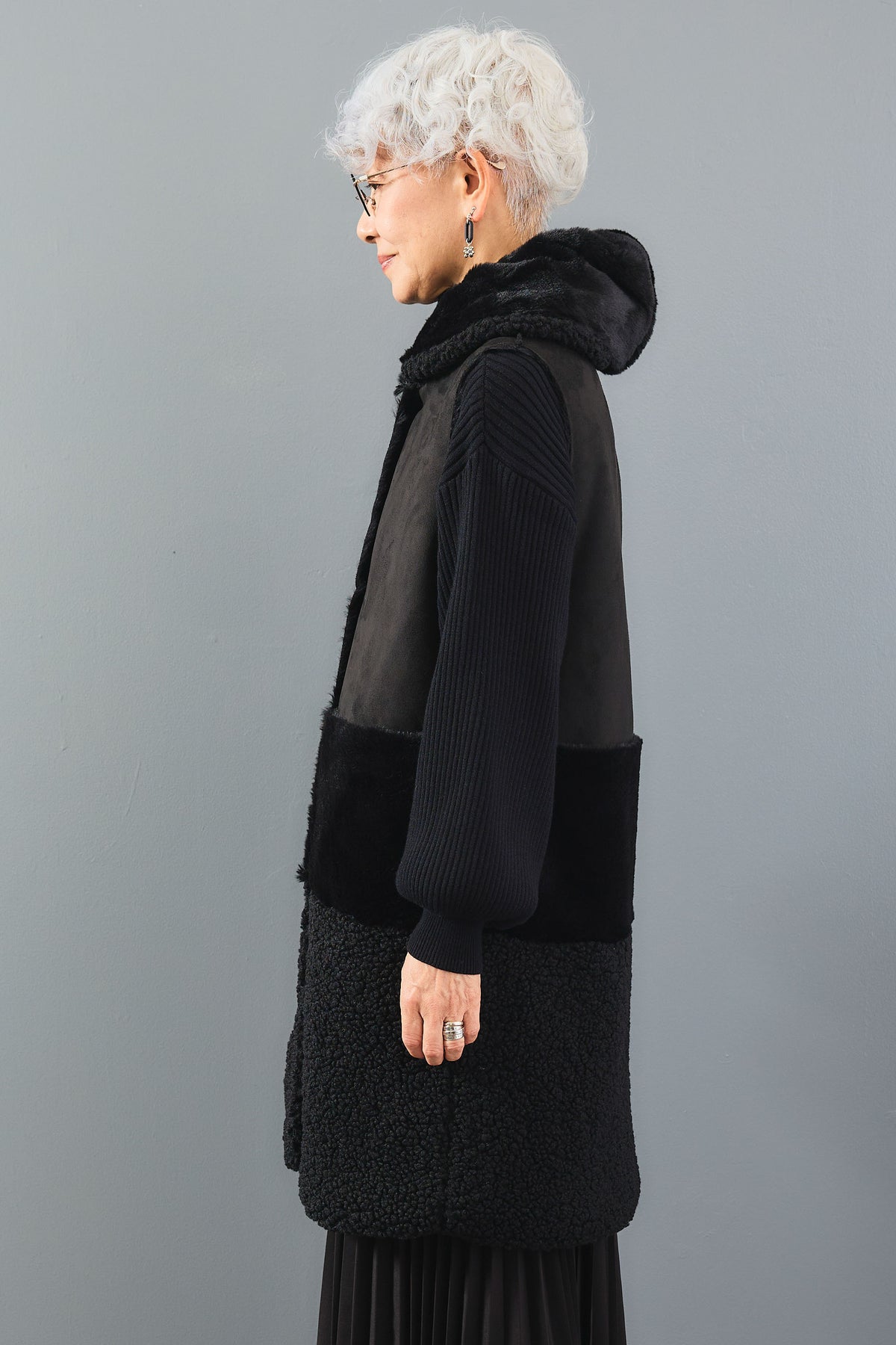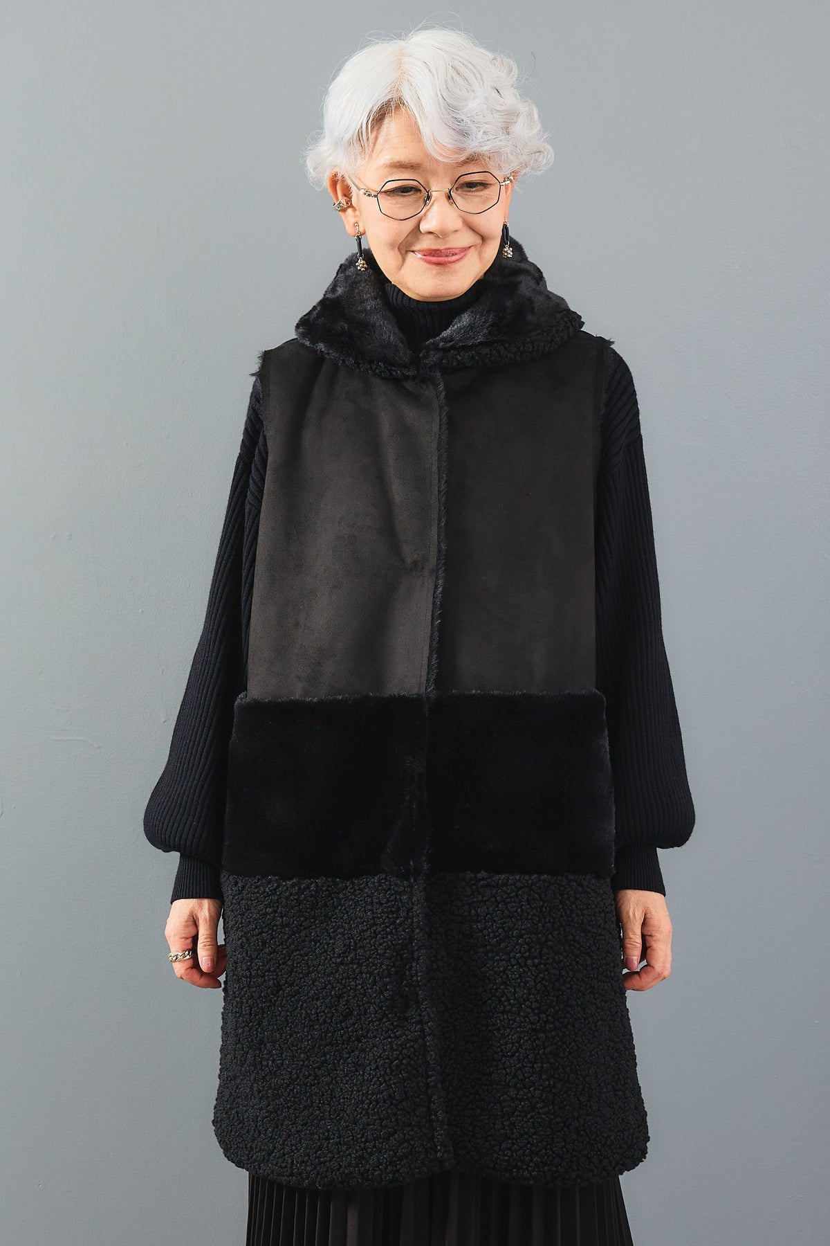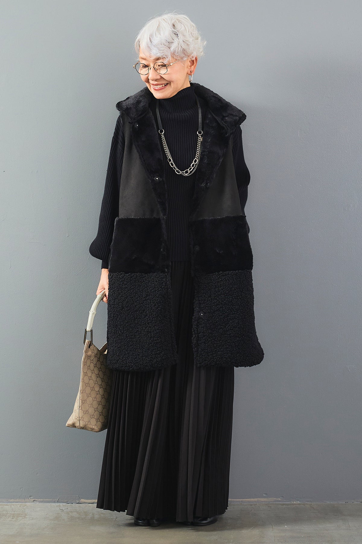 スエードとファーを組み合わせた上品なミディ丈ベスト。異素材の切り替えが奥行きを生み、着るだけで洗練された印象に。軽やかな着心地ながら暖かく、季節の変わり目のアウターとしても活躍します。シンプルなトップスに重ねるだけで、トレンド感のあるスタイリングが完成します。