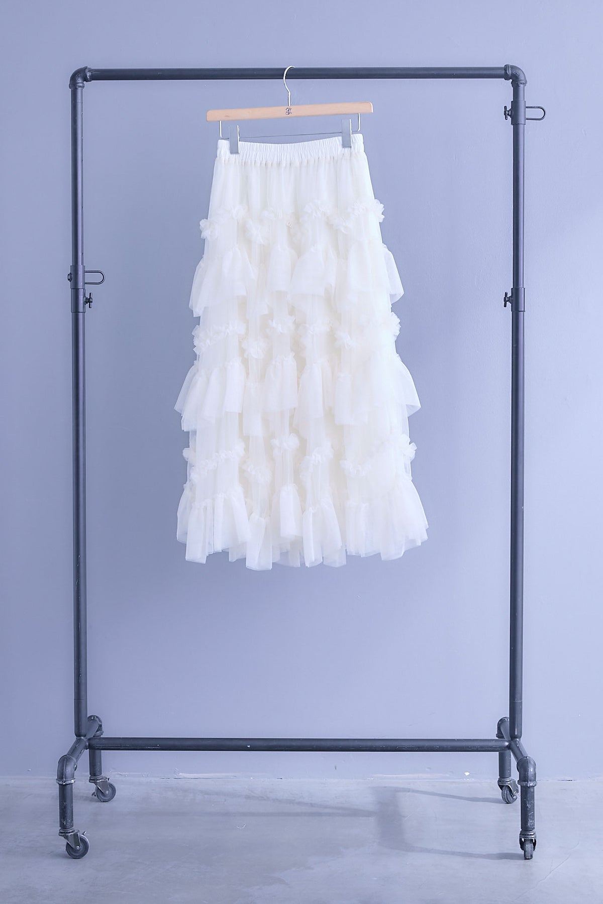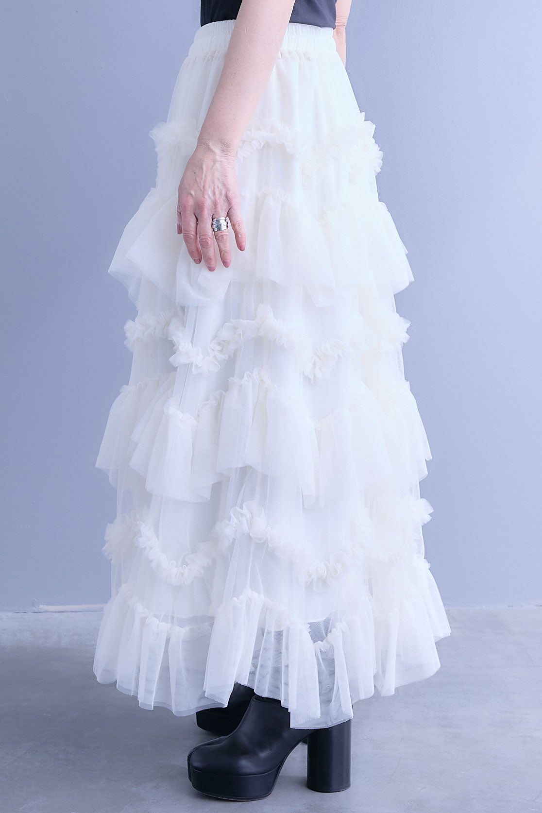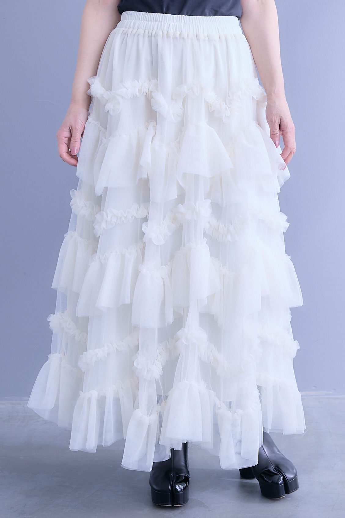 幾重にも重なったチュールフリルが華やかな存在感を放つティアードスカート。軽やかな透け感と立体的なボリュームが動くたびに表情を生み、スタイリングに奥行きを添えます。甘さのあるデザインながらもロング丈でバランスが取りやすく、カジュアルなトップスからきれいめなアイテムまで幅広く好相性。日常のお出かけから特別なシーンまで印象的に映える一枚です。