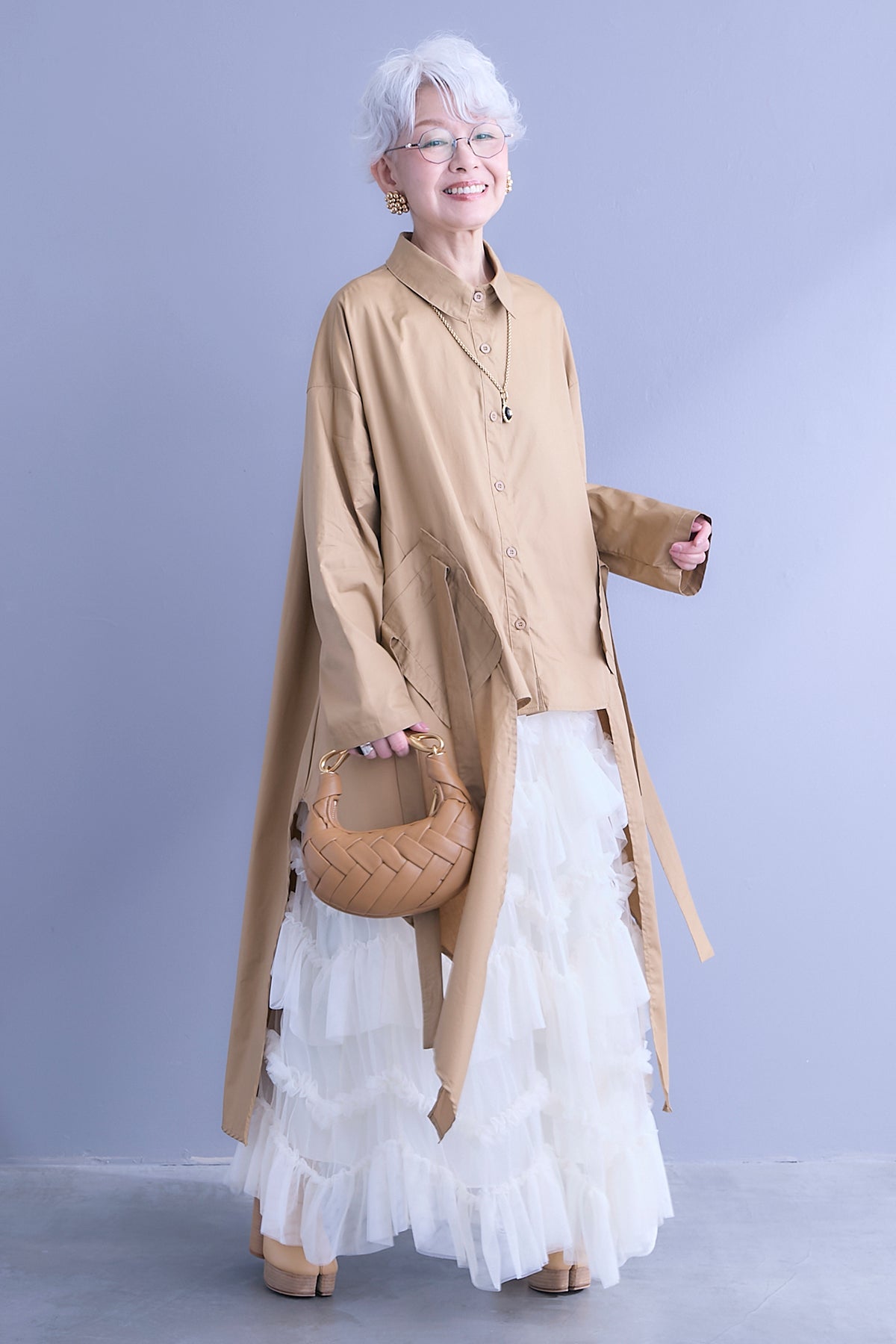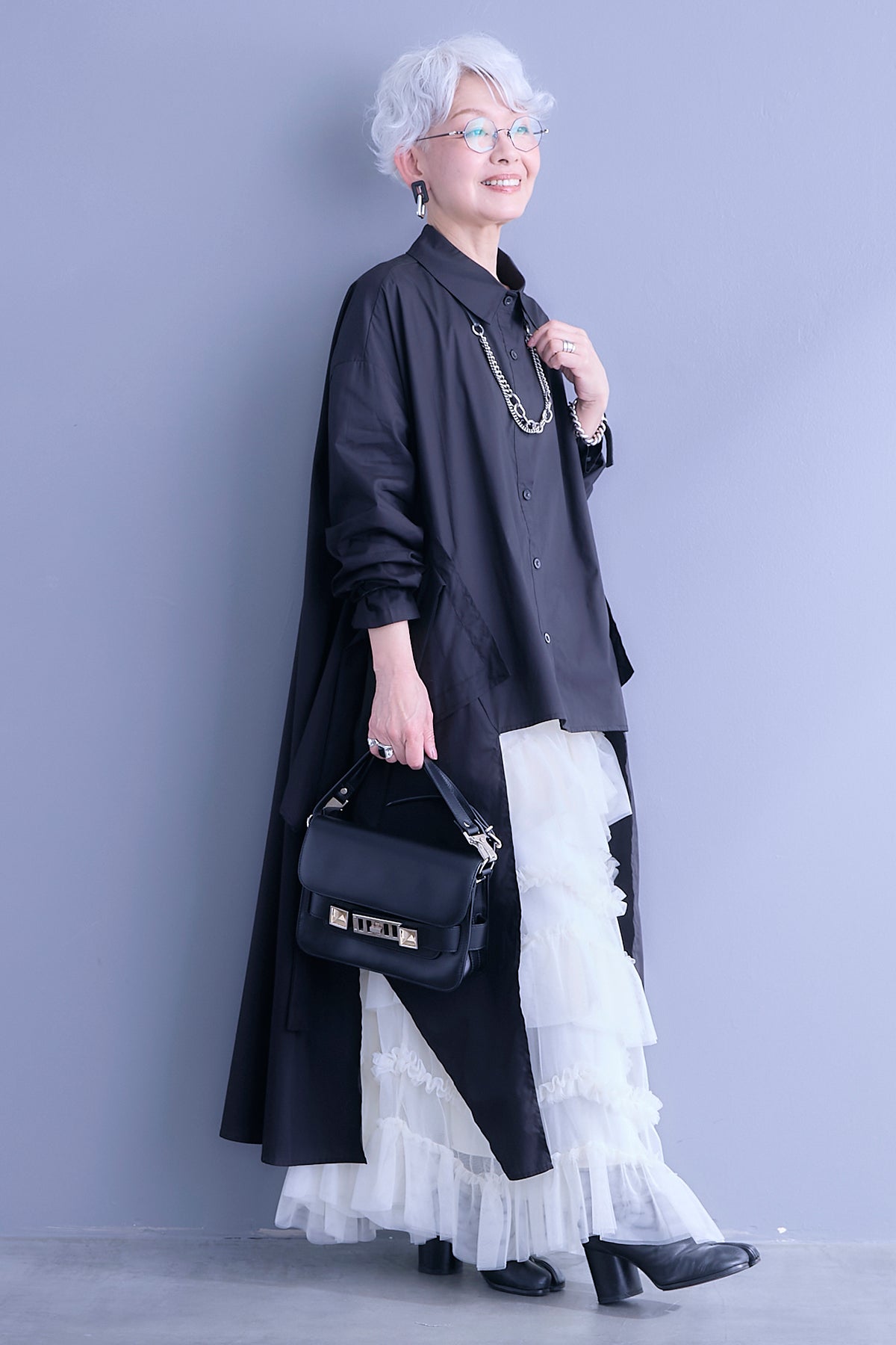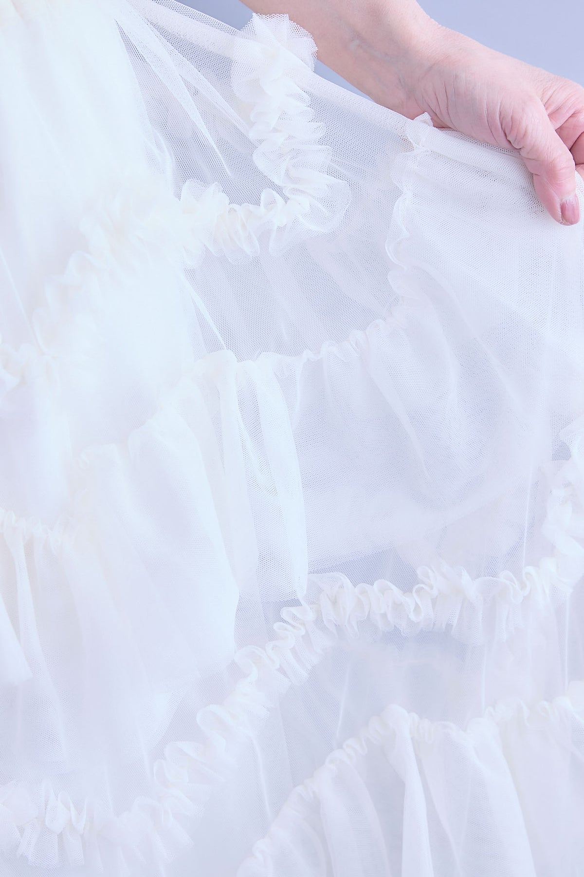 幾重にも重なったチュールフリルが華やかな存在感を放つティアードスカート。軽やかな透け感と立体的なボリュームが動くたびに表情を生み、スタイリングに奥行きを添えます。甘さのあるデザインながらもロング丈でバランスが取りやすく、カジュアルなトップスからきれいめなアイテムまで幅広く好相性。日常のお出かけから特別なシーンまで印象的に映える一枚です。