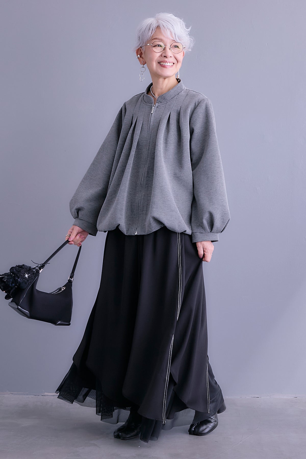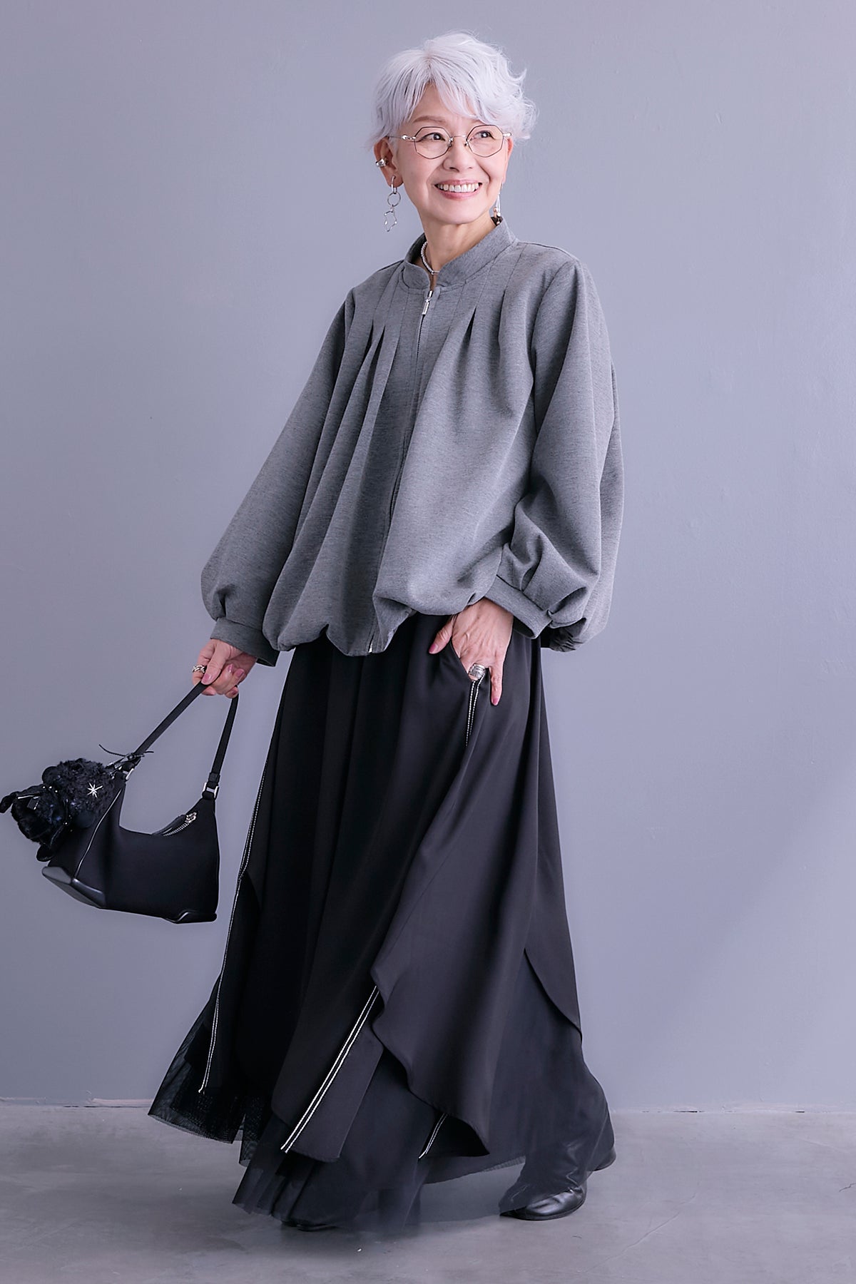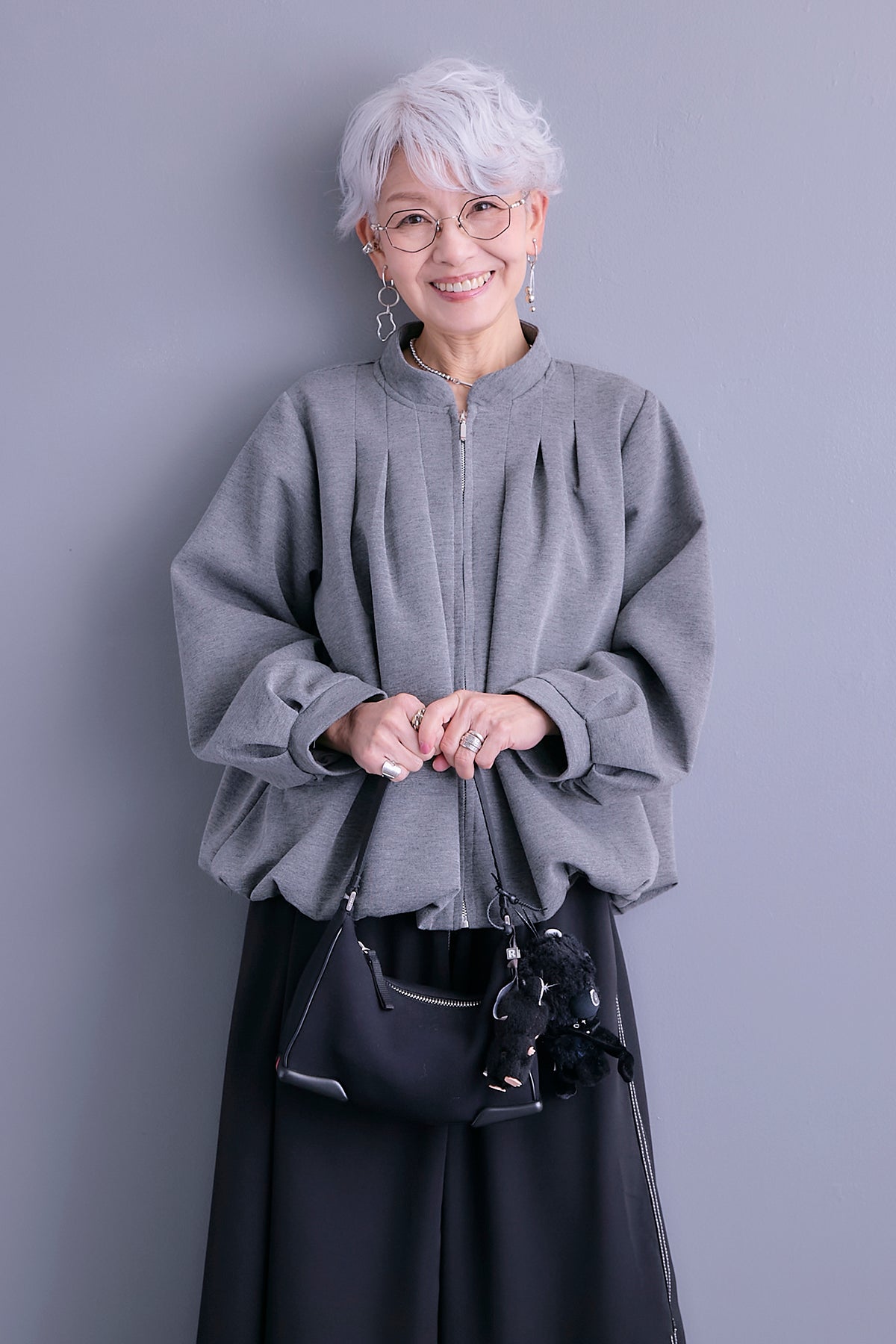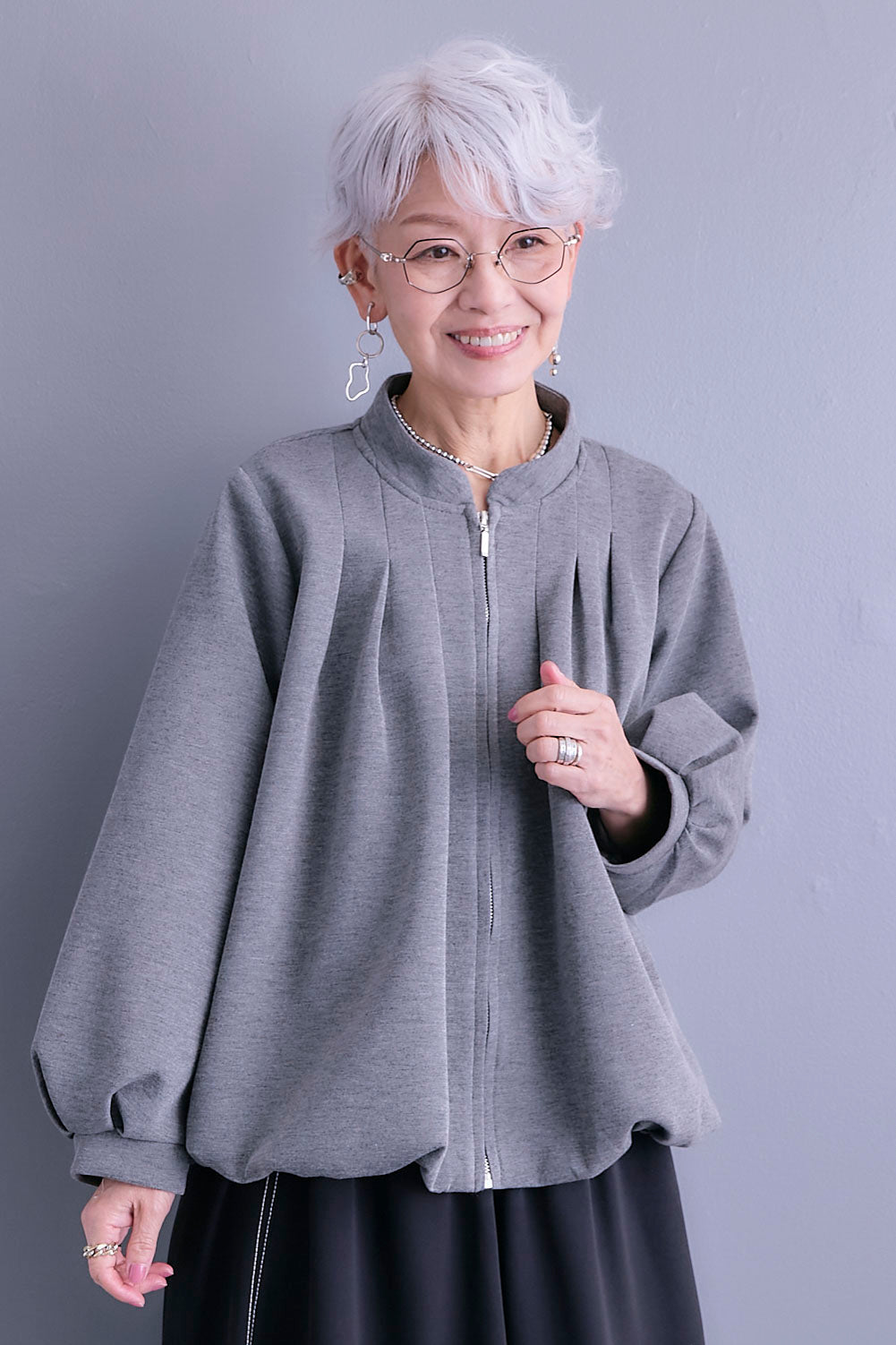 立体感のあるタックをフロントに配した、バルーンシルエットのブルゾン。丸みのあるフォルムがやわらかい陰影を生み、着るだけで印象的なシルエットに仕上がります。肩周りはゆったりと、裾はややフィットする設計で、メリハリのあるバランス。ラフさと上品さが程よく共存し、ワイドパンツからスカートまで幅広く馴染みます。軽やかな素材感で着心地がよく、ニットやカットソーの上に気負わず羽織れるのも魅力。デザイン性のあるアウターを取り入れたい日や、シンプルコーデのアップデートにもおすすめです。