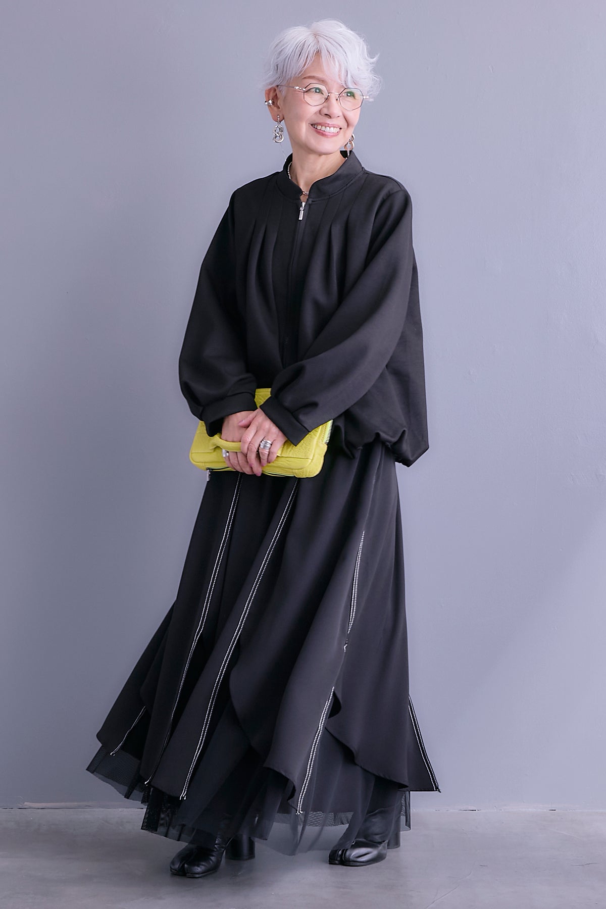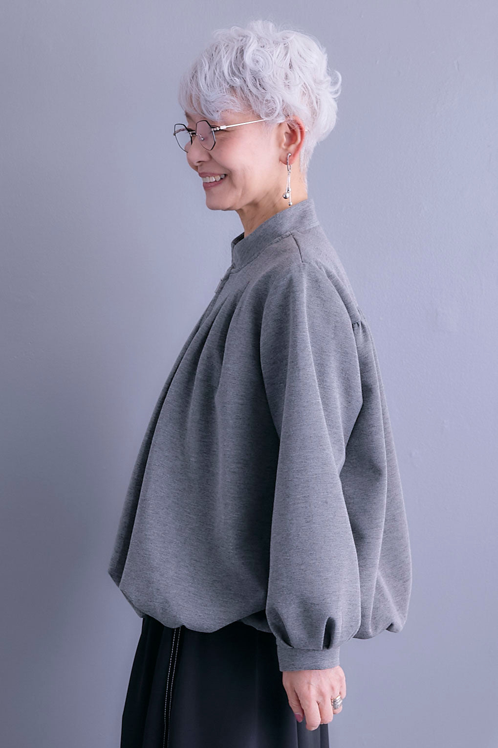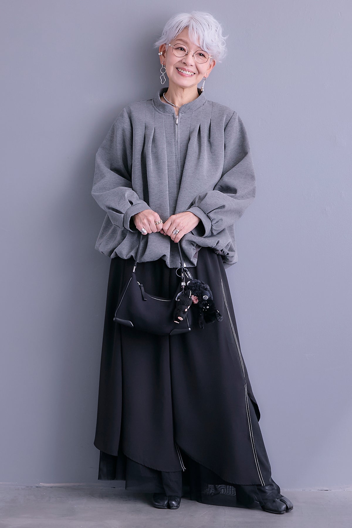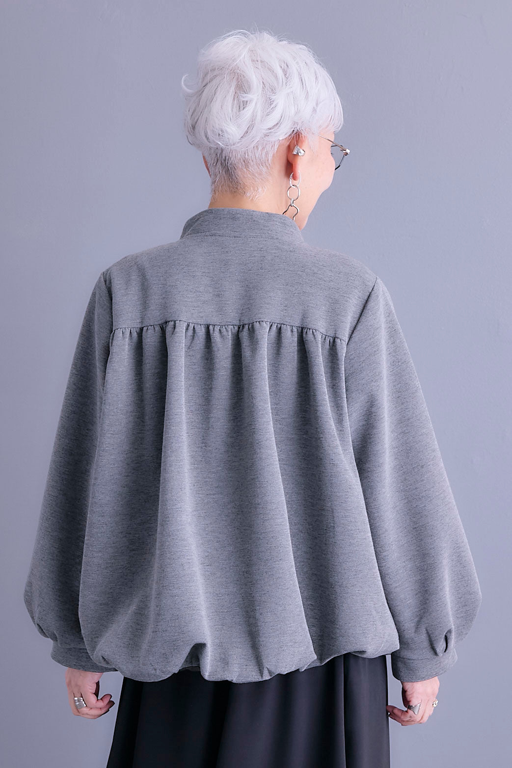立体感のあるタックをフロントに配した、バルーンシルエットのブルゾン。丸みのあるフォルムがやわらかい陰影を生み、着るだけで印象的なシルエットに仕上がります。肩周りはゆったりと、裾はややフィットする設計で、メリハリのあるバランス。ラフさと上品さが程よく共存し、ワイドパンツからスカートまで幅広く馴染みます。軽やかな素材感で着心地がよく、ニットやカットソーの上に気負わず羽織れるのも魅力。デザイン性のあるアウターを取り入れたい日や、シンプルコーデのアップデートにもおすすめです。