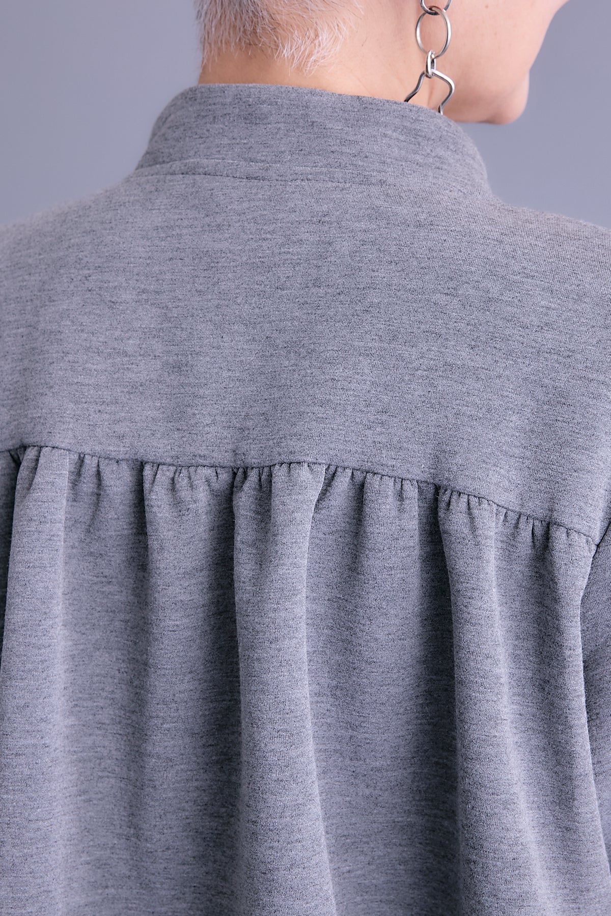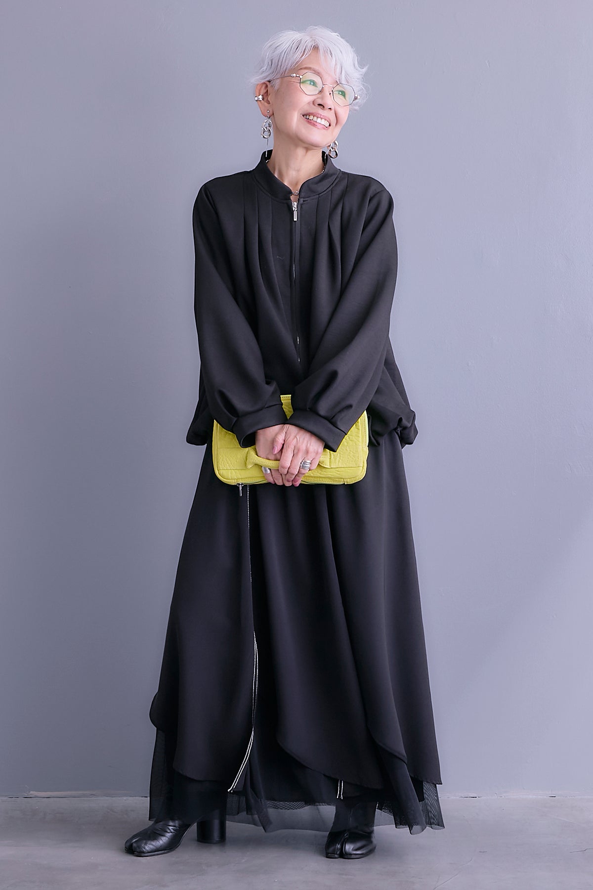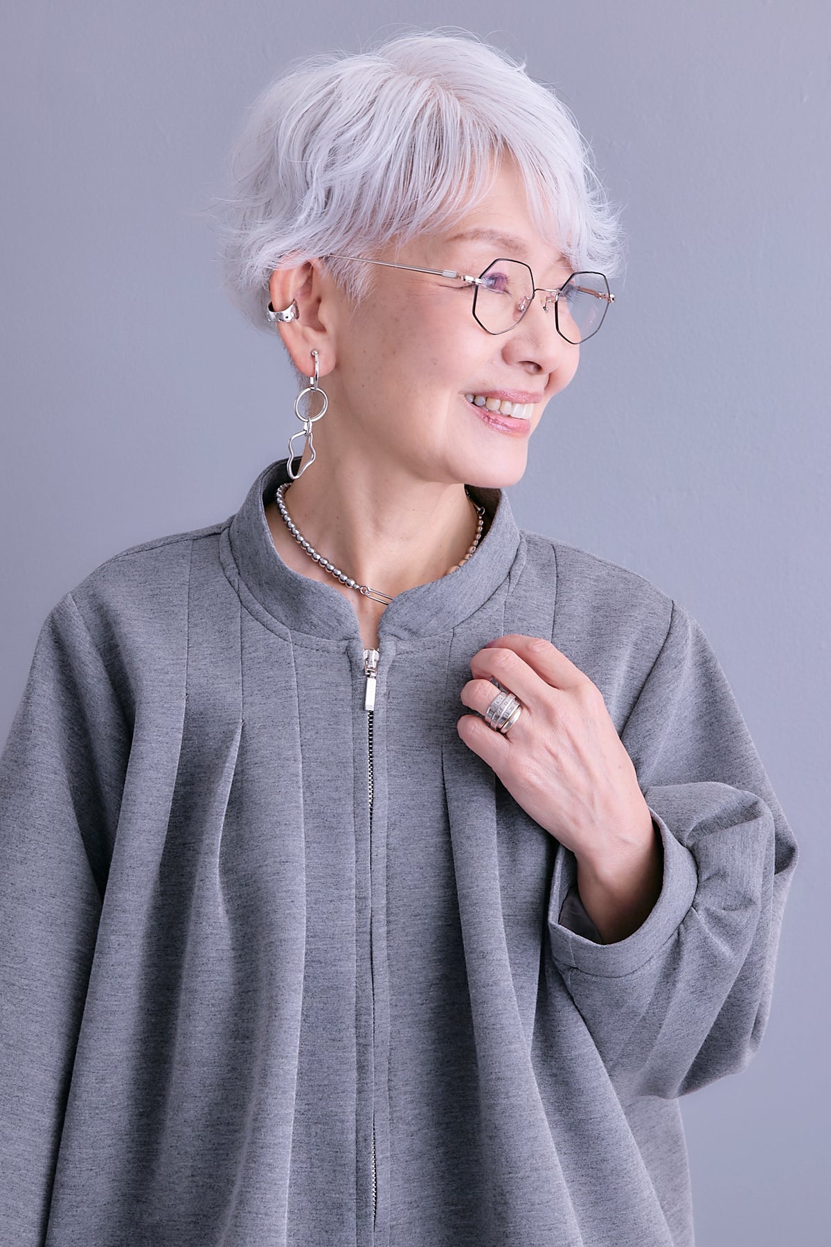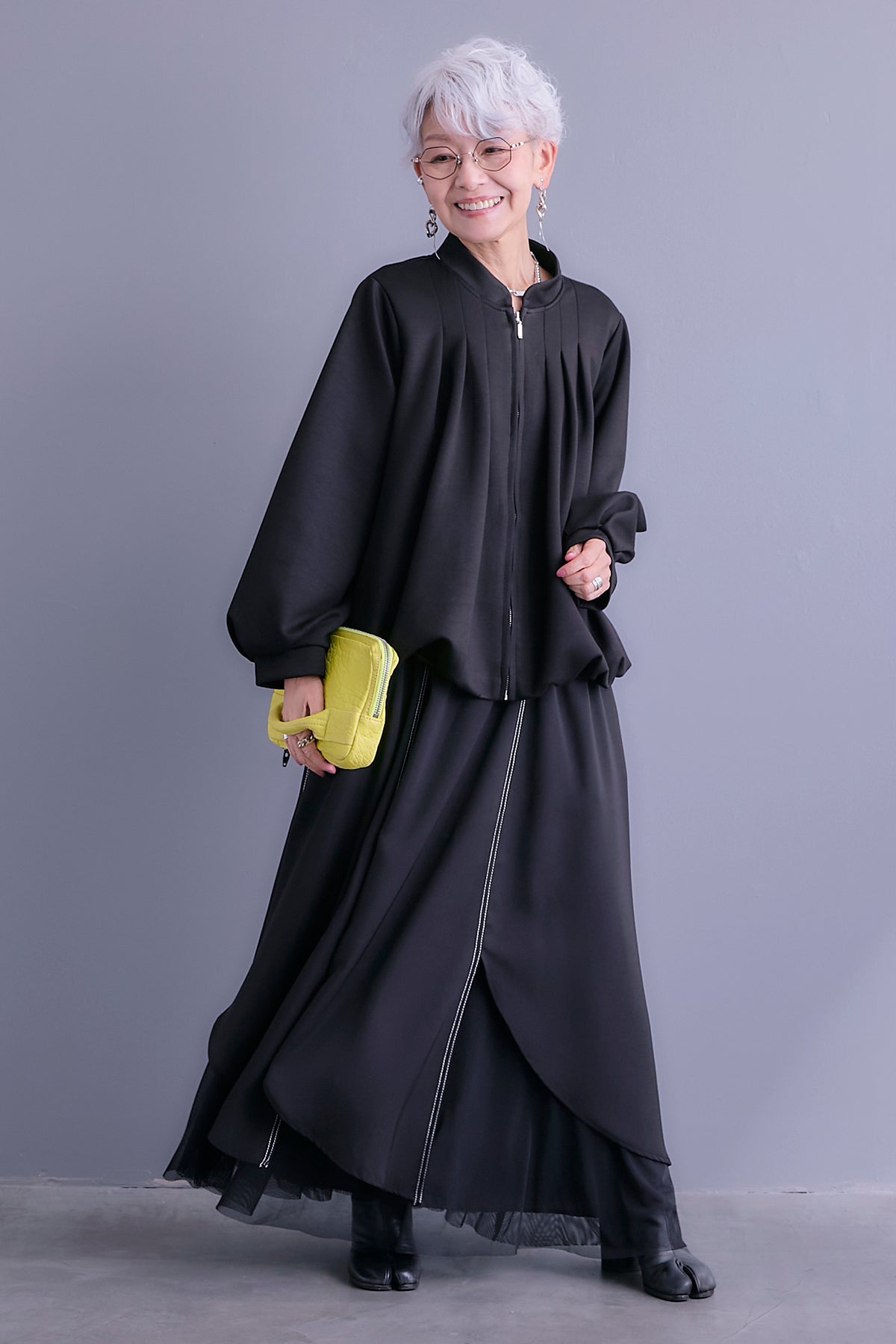 立体感のあるタックをフロントに配した、バルーンシルエットのブルゾン。丸みのあるフォルムがやわらかい陰影を生み、着るだけで印象的なシルエットに仕上がります。肩周りはゆったりと、裾はややフィットする設計で、メリハリのあるバランス。ラフさと上品さが程よく共存し、ワイドパンツからスカートまで幅広く馴染みます。軽やかな素材感で着心地がよく、ニットやカットソーの上に気負わず羽織れるのも魅力。デザイン性のあるアウターを取り入れたい日や、シンプルコーデのアップデートにもおすすめです。
