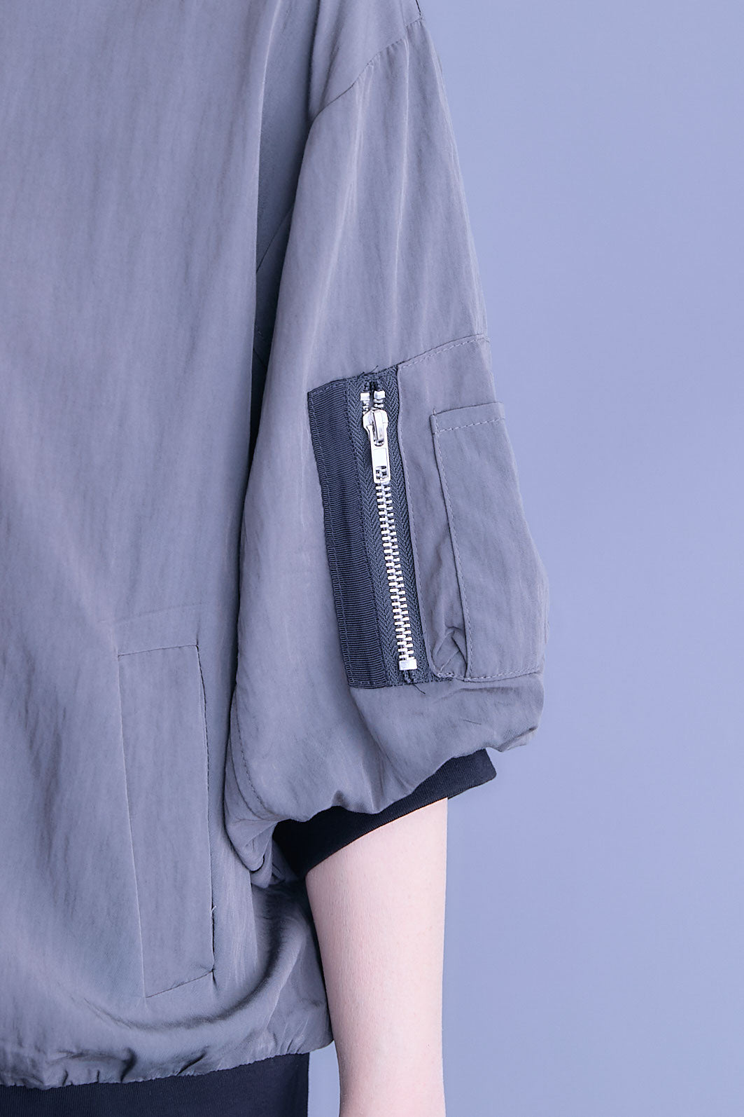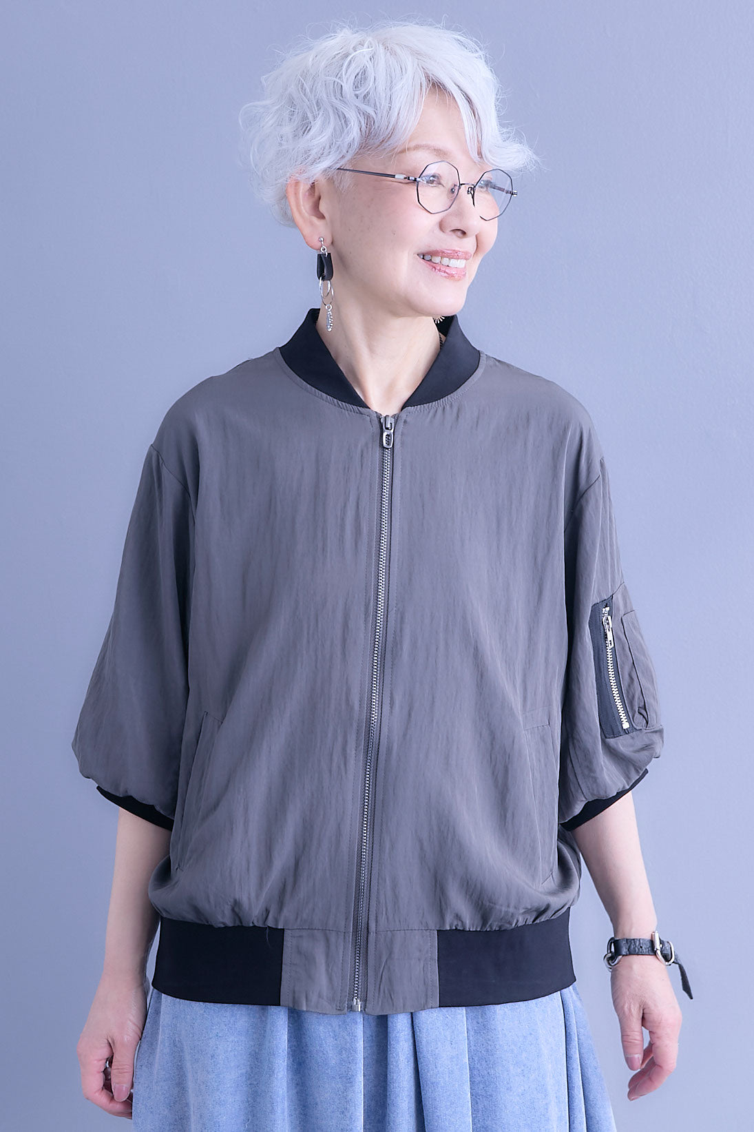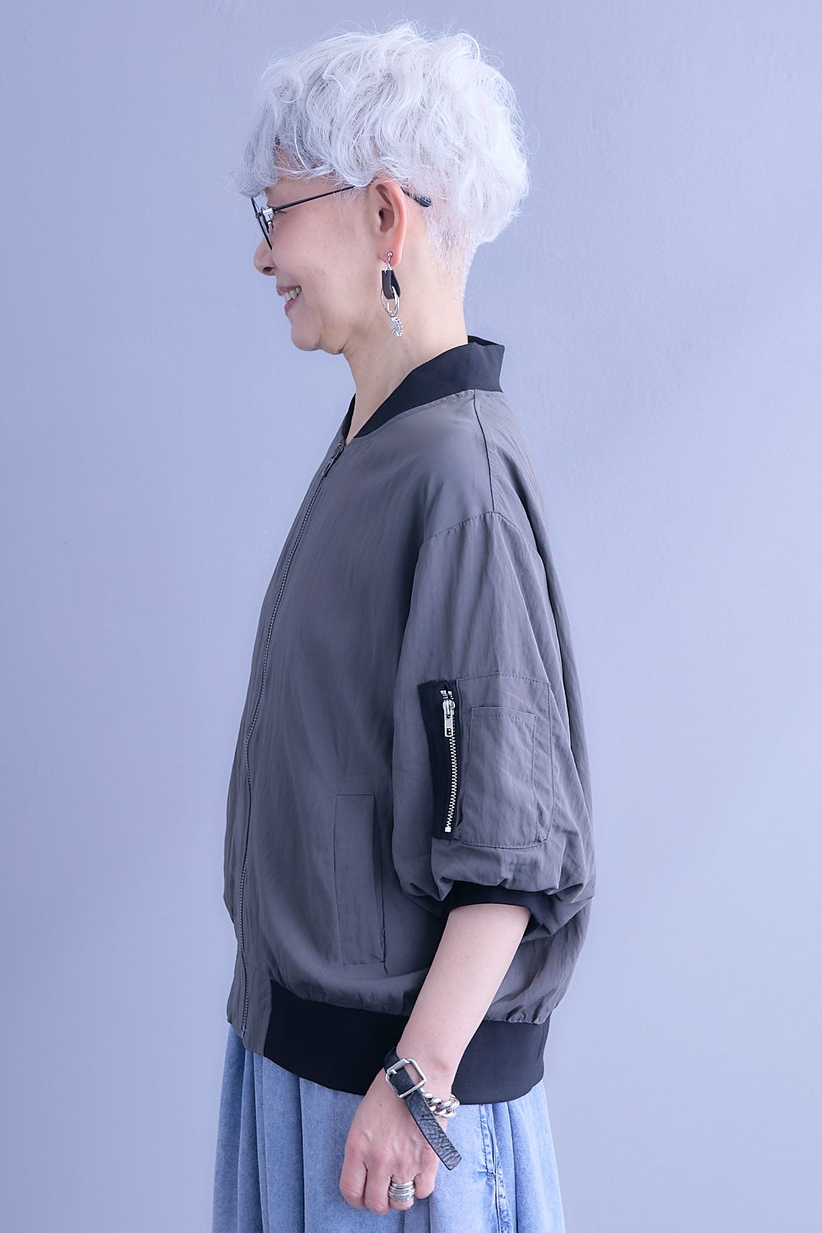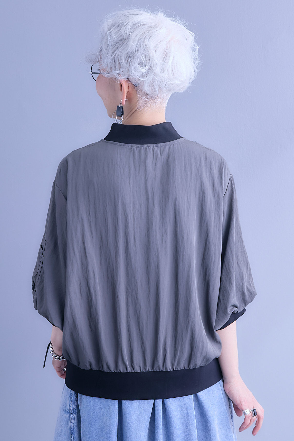 丸みのあるバルーンスリーブが印象的なハーフスリーブMA-1ジャケット。程よいボリューム感がシンプルな装いにアクセントを添え、軽やかに羽織れる一枚です。コンパクトな丈感でバランスが取りやすく、ワンピースやワイドボトムとも好相性。カジュアルな中にも洗練された雰囲気を感じさせ、季節の変わり目や気温調整にも活躍するデイリーに取り入れやすいアイテムです。