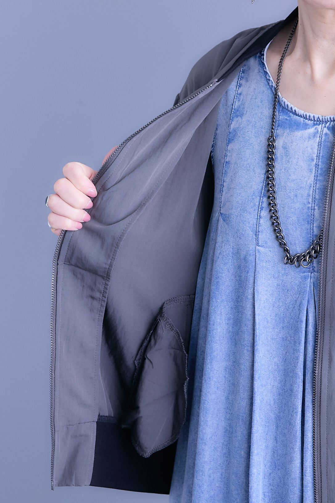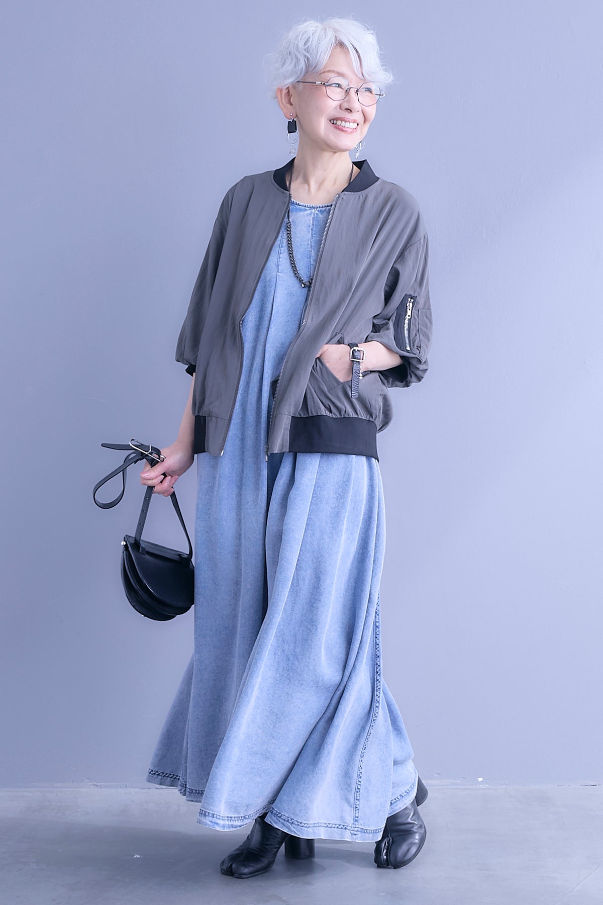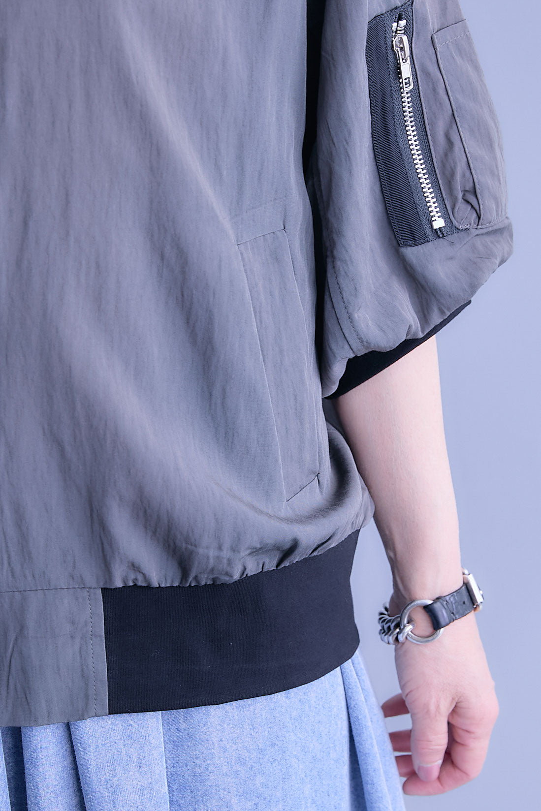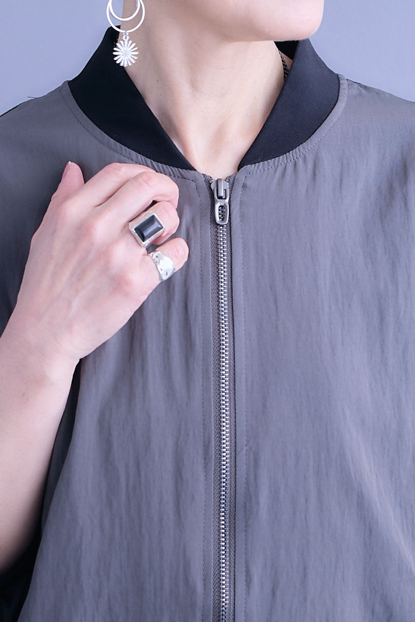 丸みのあるバルーンスリーブが印象的なハーフスリーブMA-1ジャケット。程よいボリューム感がシンプルな装いにアクセントを添え、軽やかに羽織れる一枚です。コンパクトな丈感でバランスが取りやすく、ワンピースやワイドボトムとも好相性。カジュアルな中にも洗練された雰囲気を感じさせ、季節の変わり目や気温調整にも活躍するデイリーに取り入れやすいアイテムです。